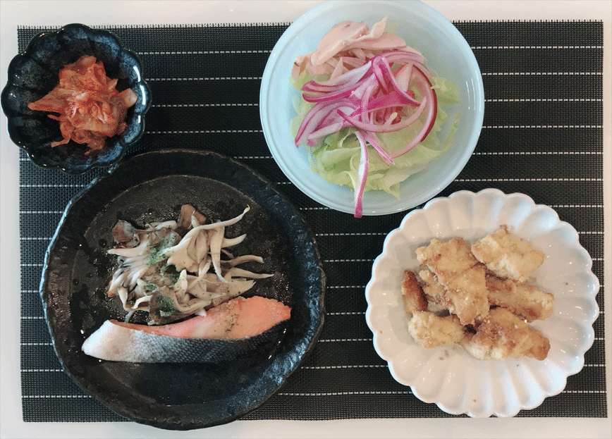 鮭とマイタケは昼間トースーターで一緒に焼いたの