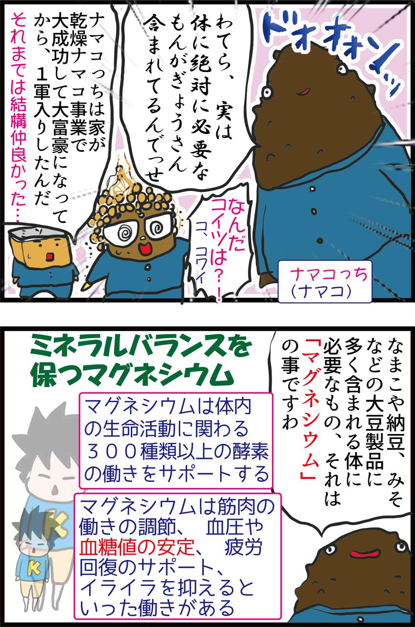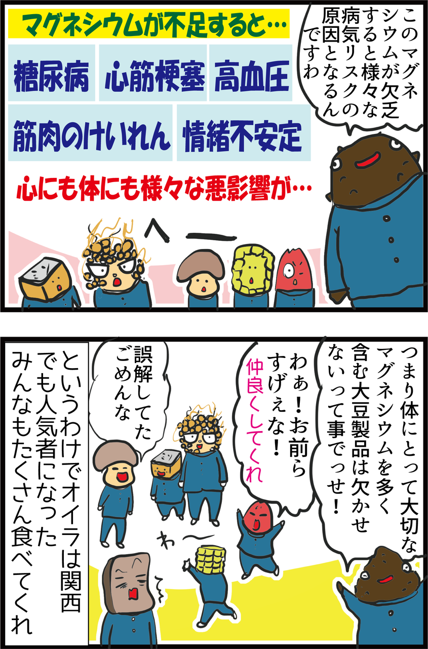 マグネシウム、大豆にも含まれてるんですね~カルシウムとかはなんとなく分かるけど、マグネシウムって、?って感じだったから、とても勉強になりました!ありがとうございます。