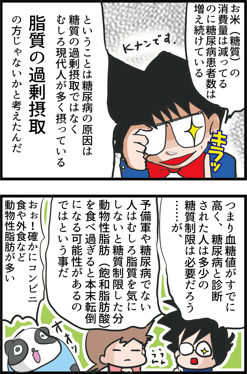 ダイエットや糖尿病予防などのつもりでお米やパンを控えて脂肪分の高い食事ばかり摂っていると逆に糖尿病になってしまったり…なんてこともあるかもしれない