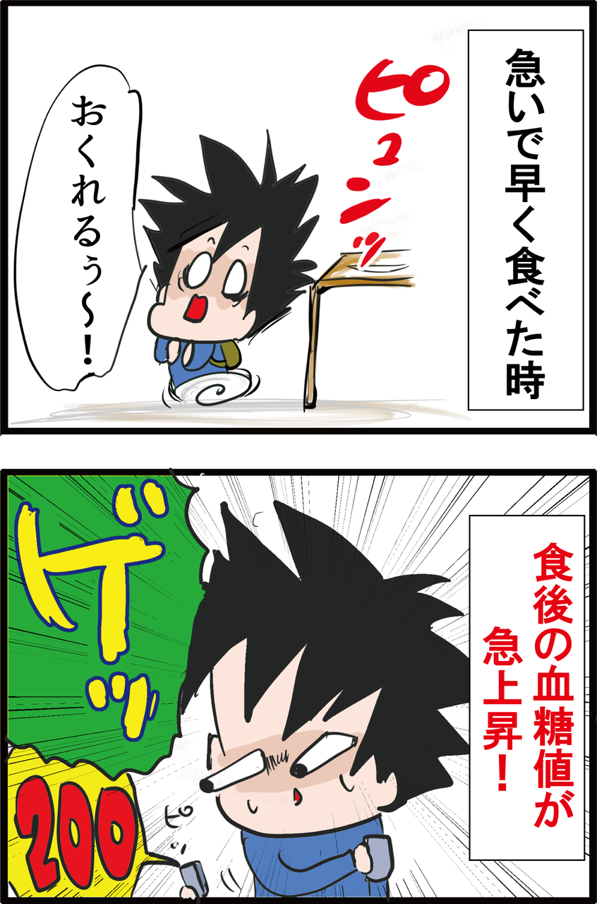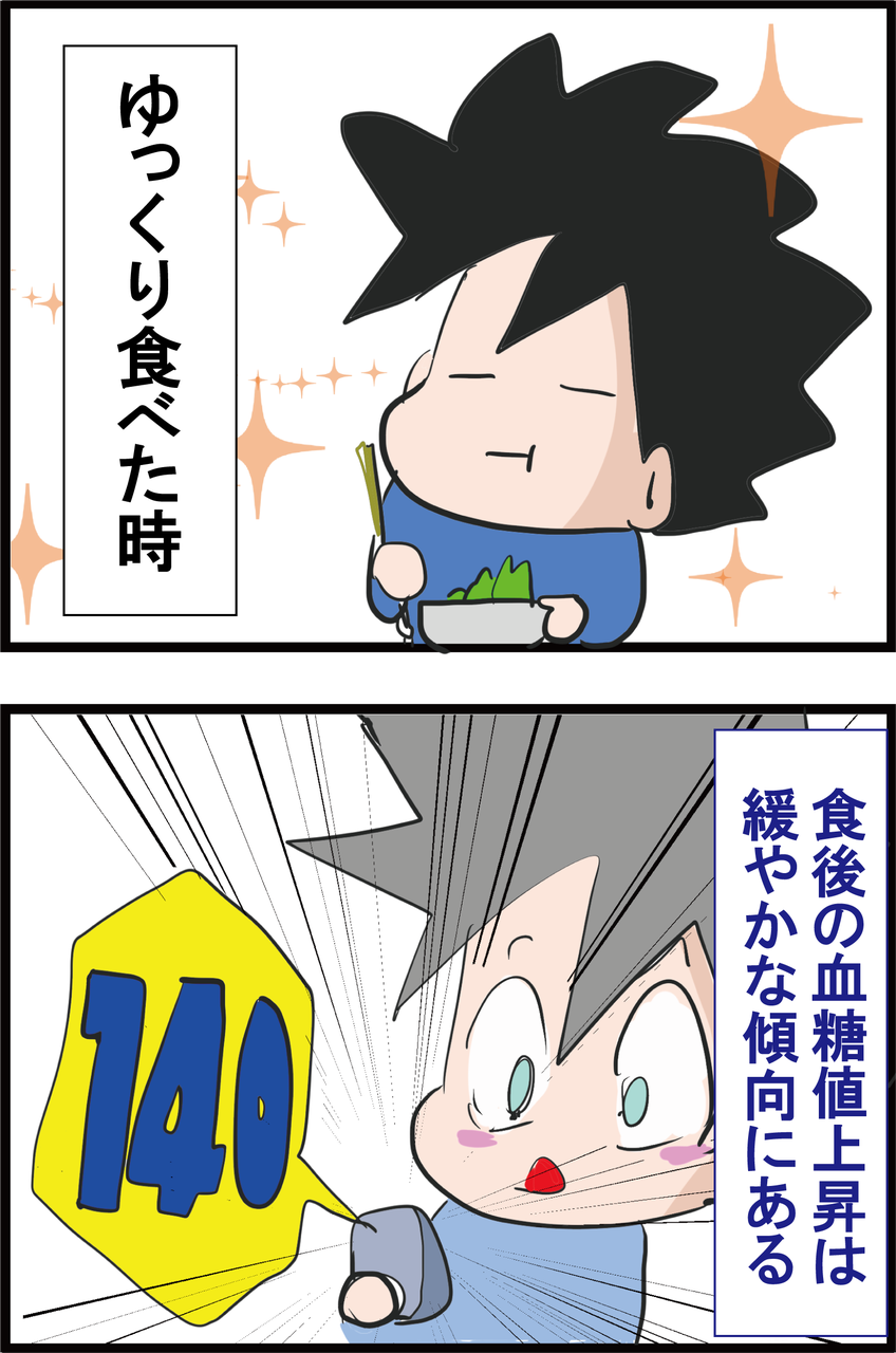 逆にゆっくり食べると食後血糖値上昇が緩やかになり、ダイエットにもなる