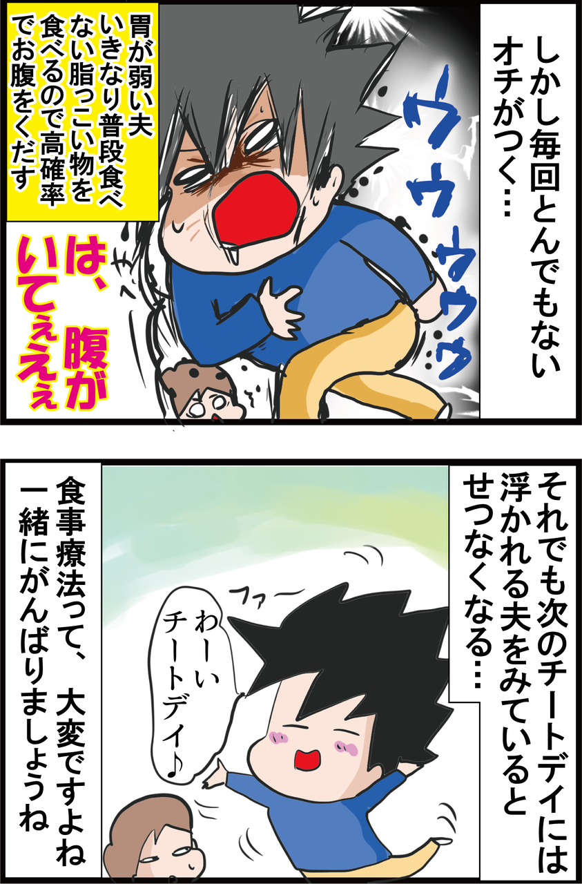 タンパク質は一食につき絶対とりたいですが、それも量は100gくらいにした方が、消化吸収の妨げになりません。それ以上は消化不良を起こしやすいです。(旦那さんの場合チートデイにお腹を壊すのは恐らくそれが原因かと)