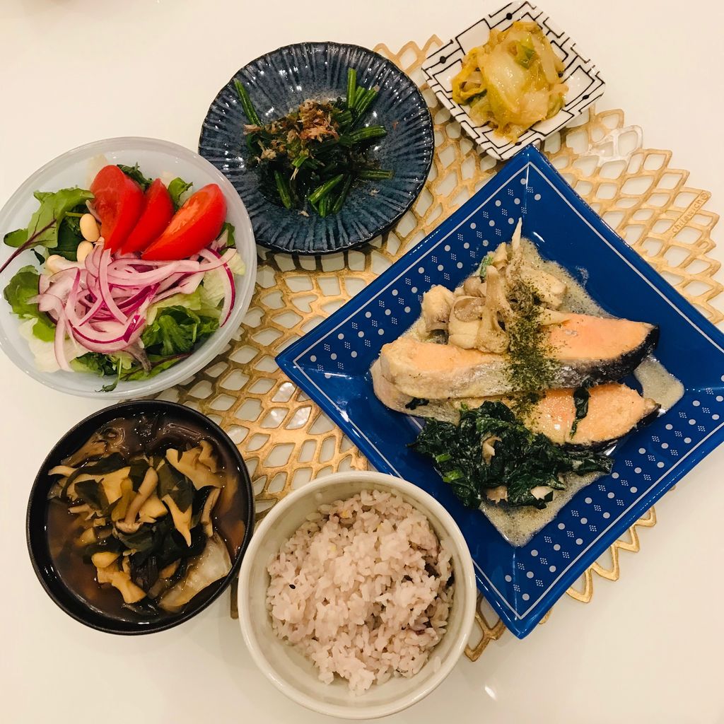 サーモン豆乳スープ仕立て、マイタケとほうれん草添え(パセリがけ)