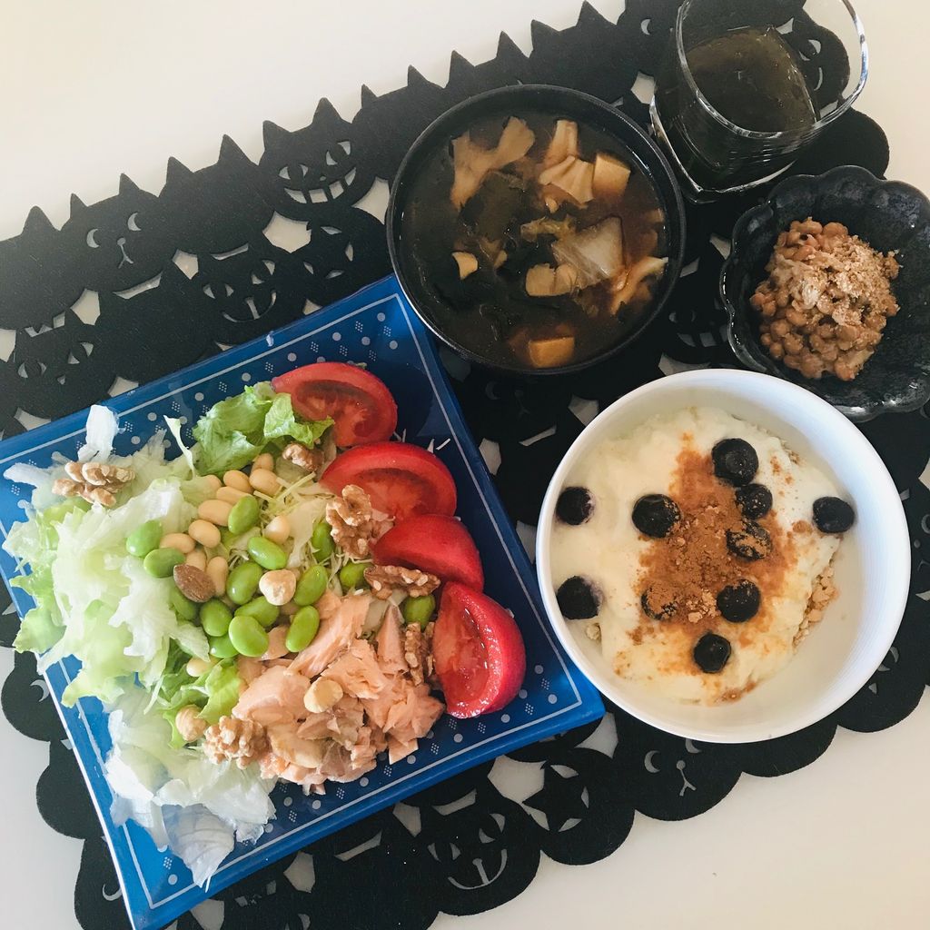 サラダ(レタス、キャベツ、枝豆、トマト、ナッツ、茹で大豆、サラダサーモン)