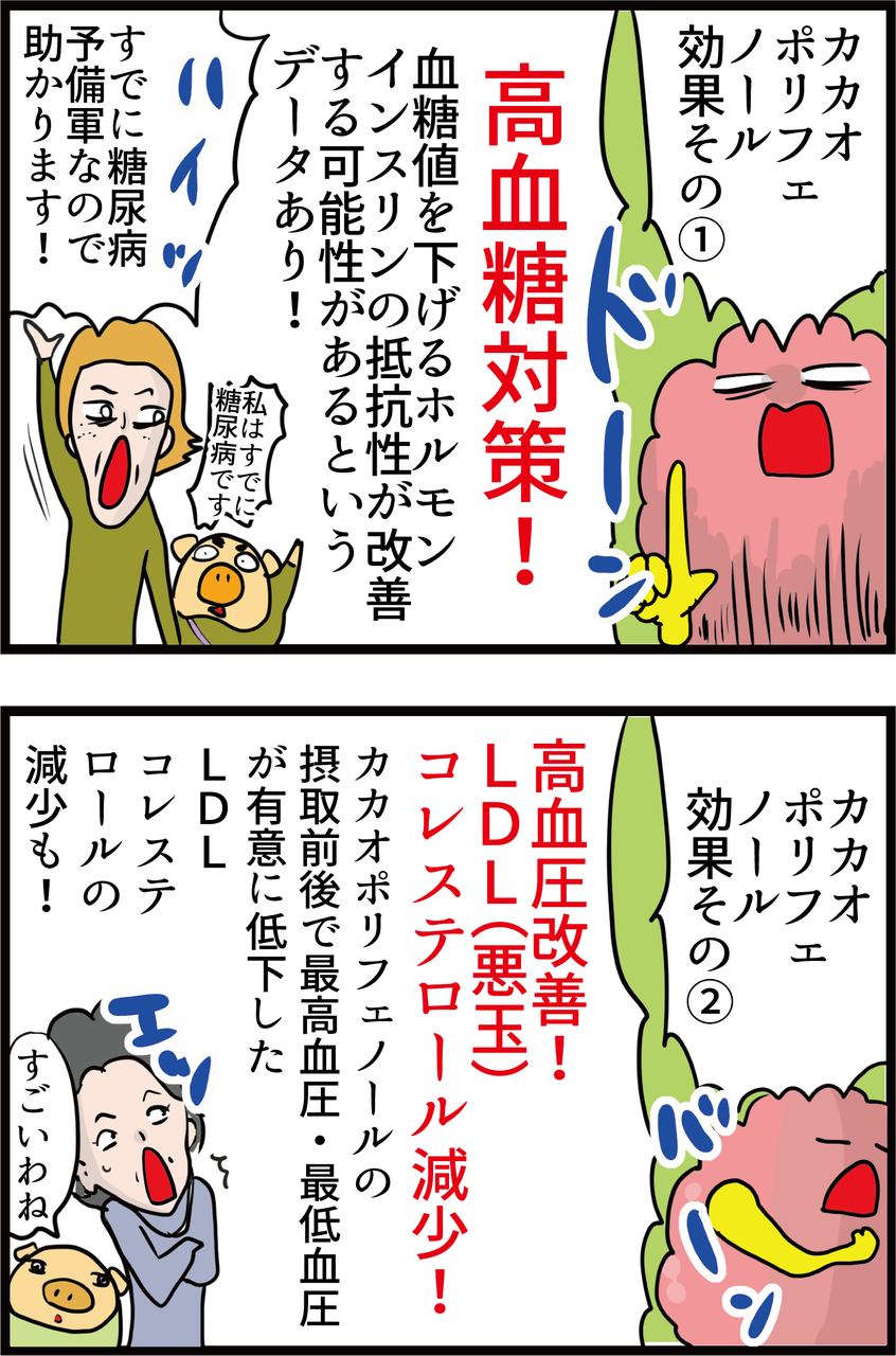 ポリフェノールの他にテオブロミンの作用で血管が広がる(=高血圧対策になる)と聞き、カカオ95 %チョコを一日6粒食べてます(^^)