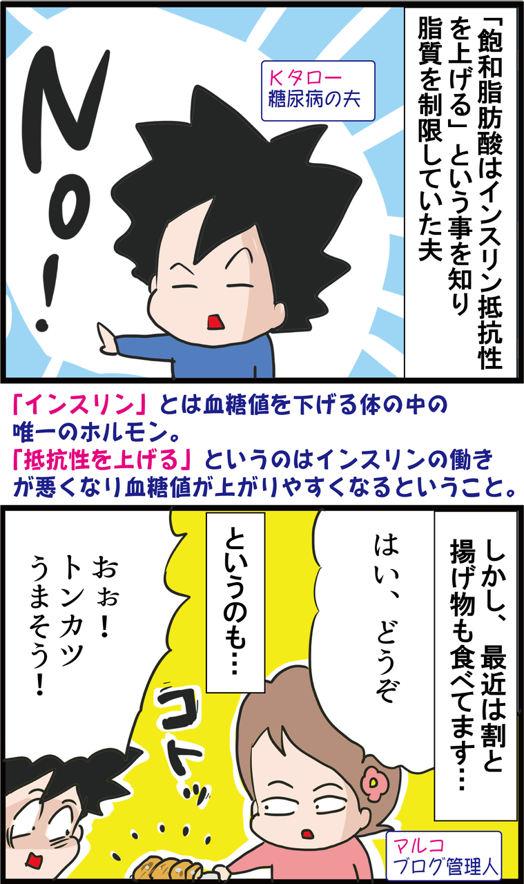 こないだまで飽和脂肪酸はインスリン抵抗性を上げると聞いて、肉は鶏むね肉、揚げ物はせずなるべく茹でたものと油の摂取を控えていたのですが、今の夫の体質や状況をふまえ、少し考えなおしました。