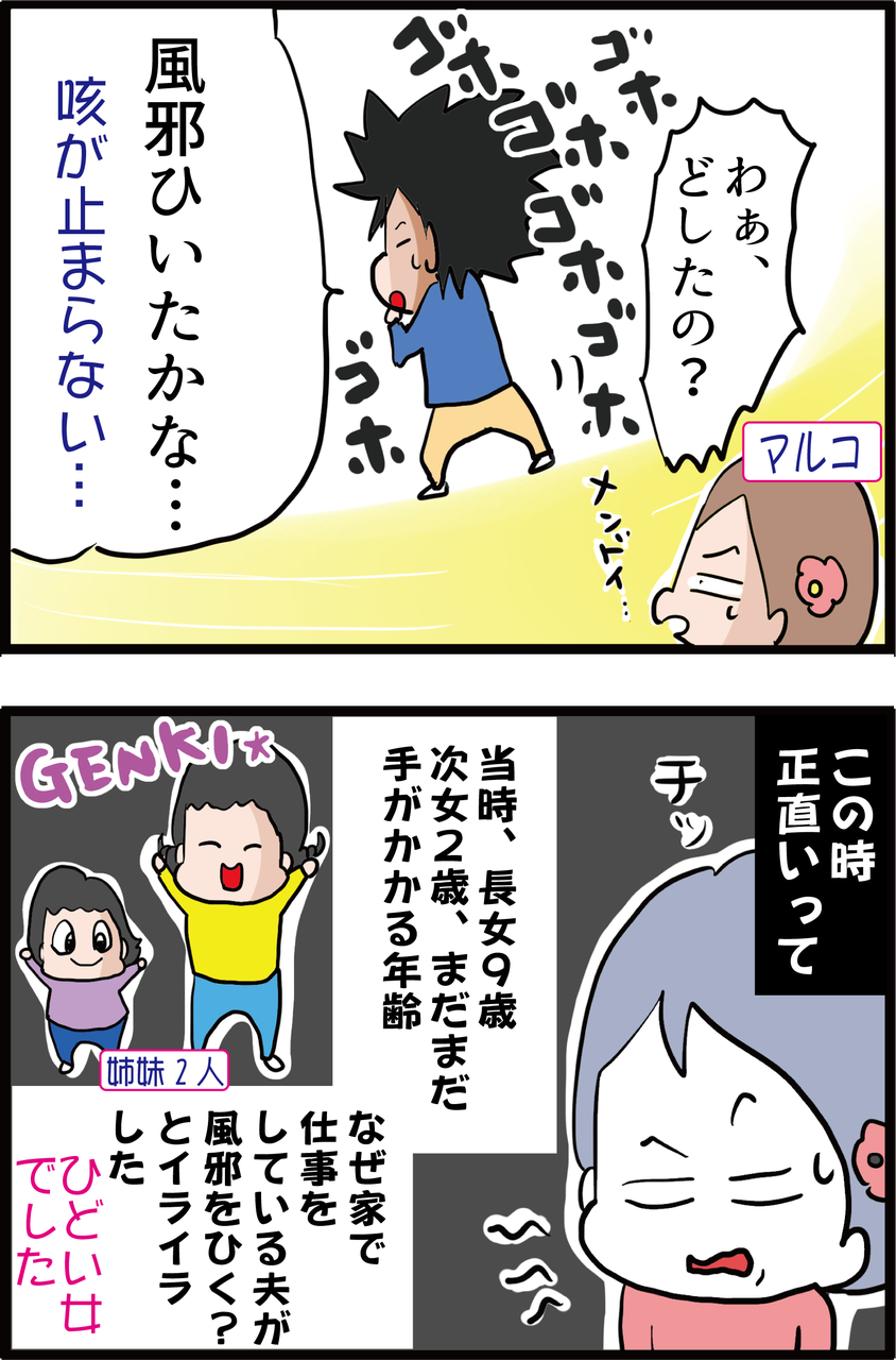 当時、次女が2歳で手がかかる時期で、夫が咳をしていて寝込んでしまったことに正直な気持ち