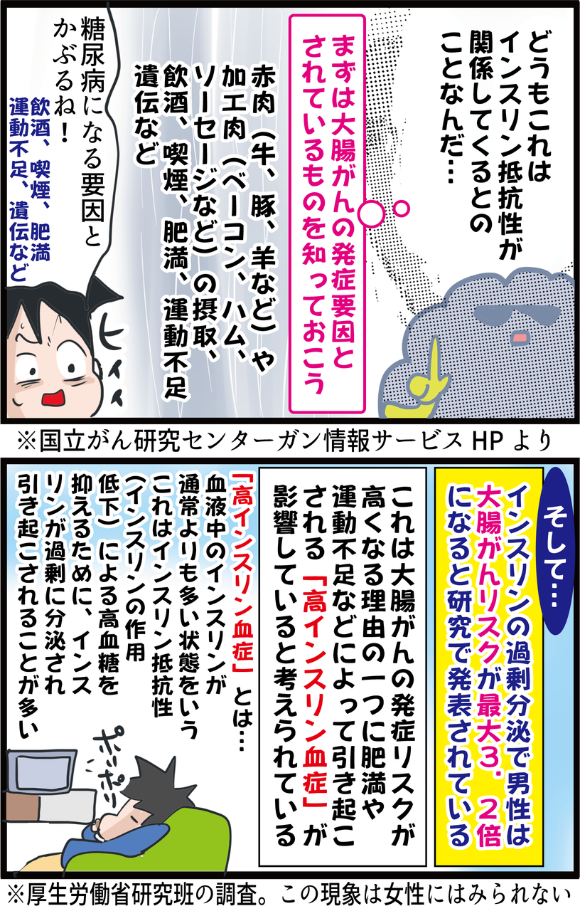 参考サイト:インスリンの過剰分泌で大腸がんリスクが3.2倍に 厚労省研究班 | ニュース・資料室 | 糖尿病ネットワーク