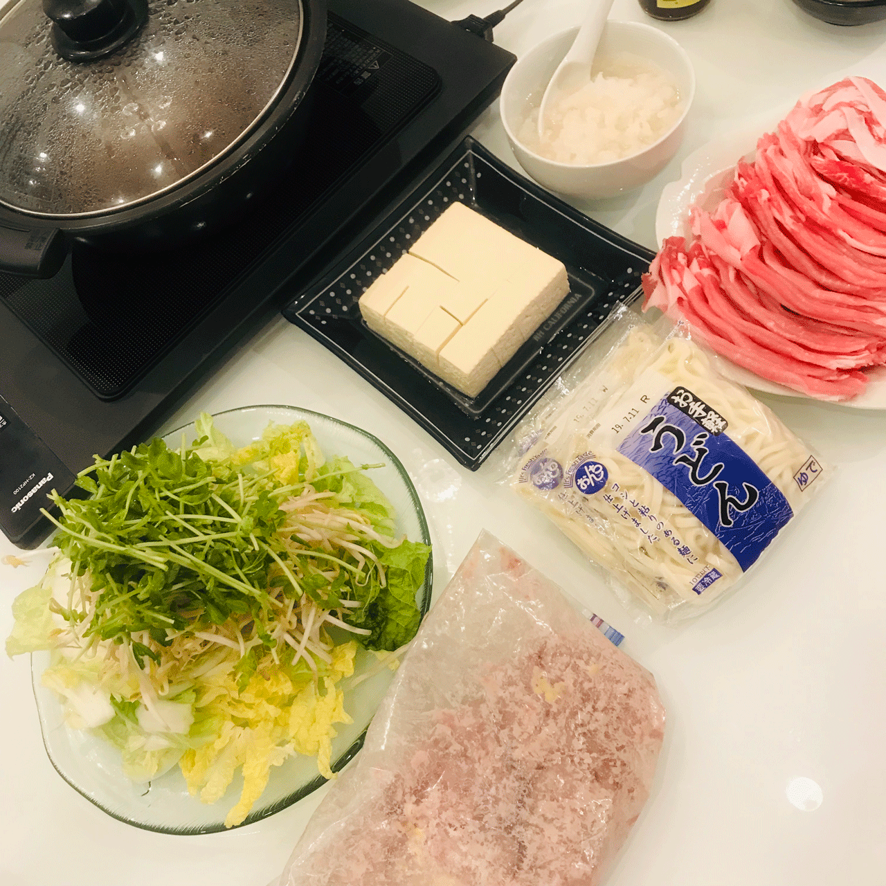 (もやし、白菜、豆苗、豆腐、大根おろし、うどん、ひき肉団子、豚ロース)