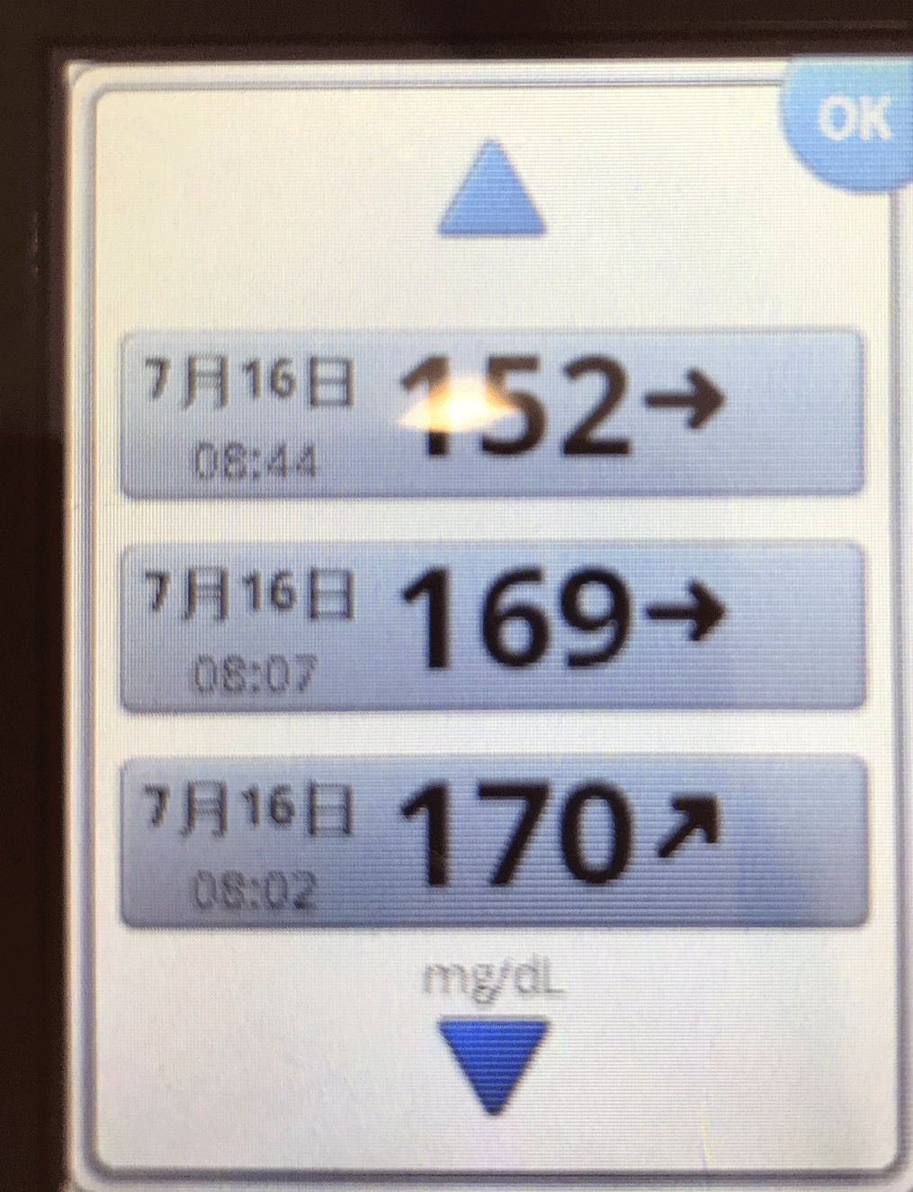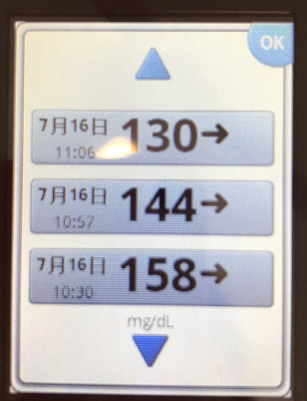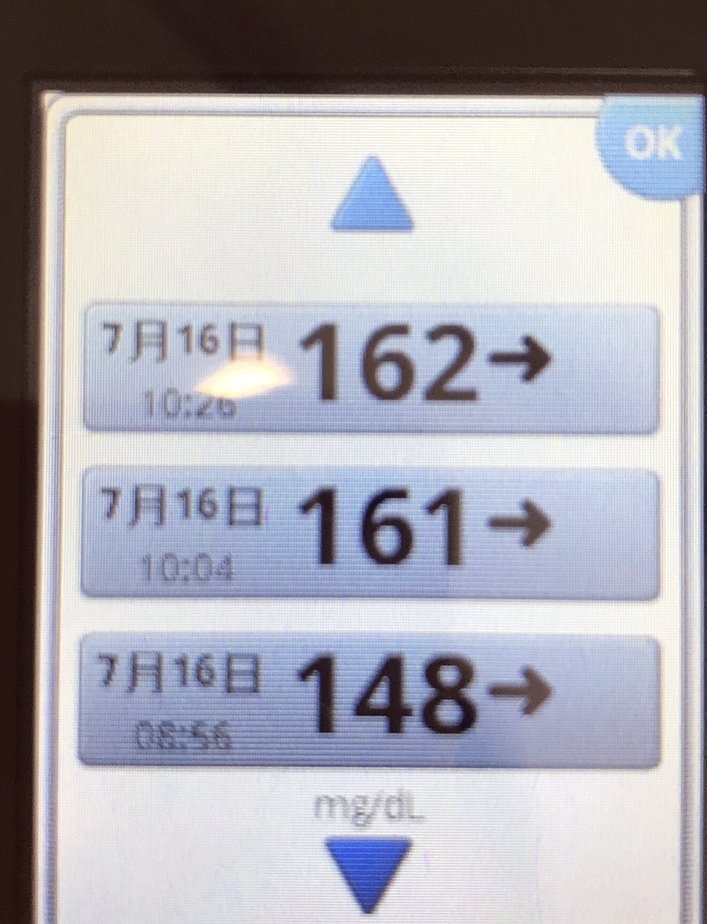 朝イチのフルーツでは170まで上がったが、サンドイッチを食べても最大162までしか上がらなかった