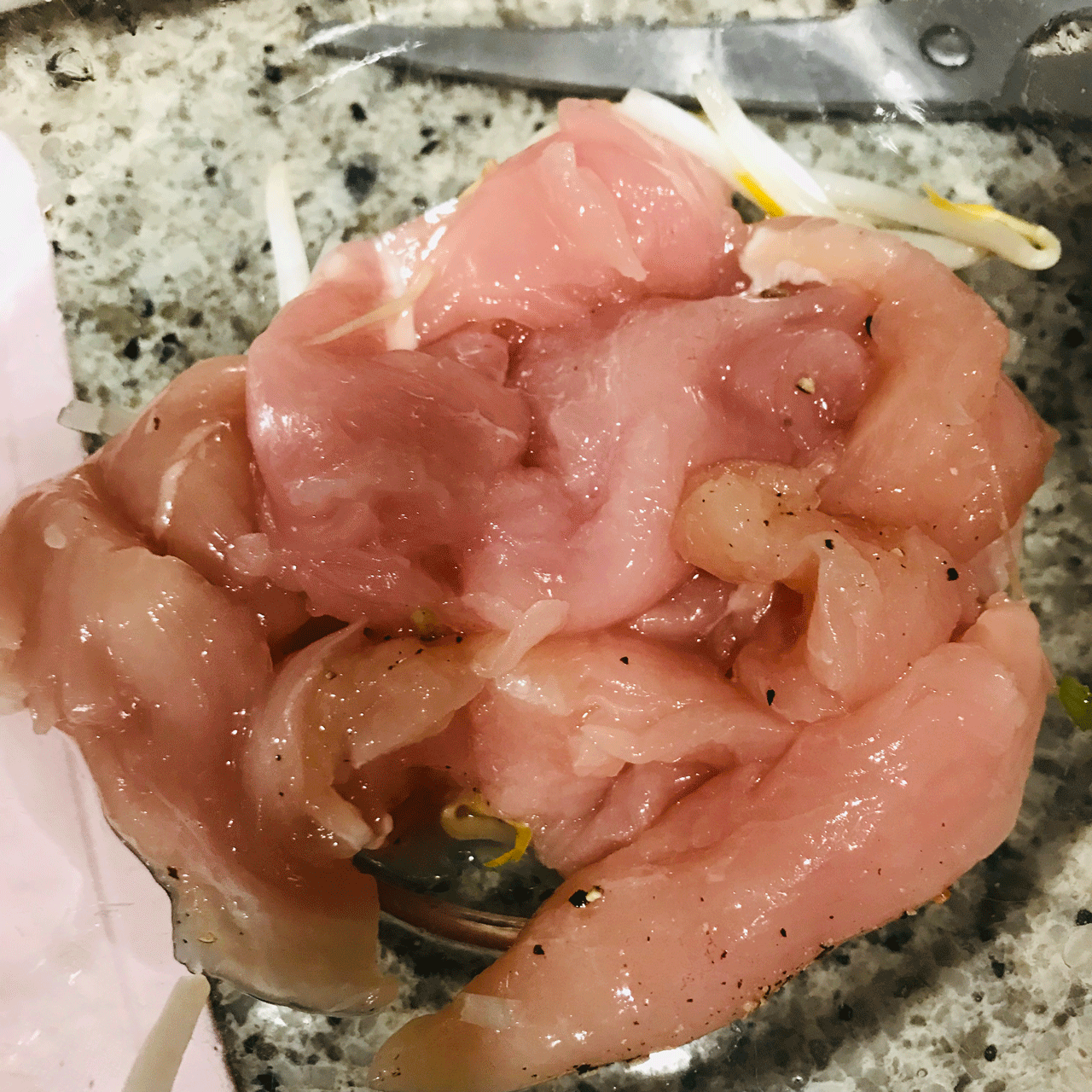②①をラップしたまま冷ます。冷めたらササミをほぐす。この時、赤いところがないかよくみる。