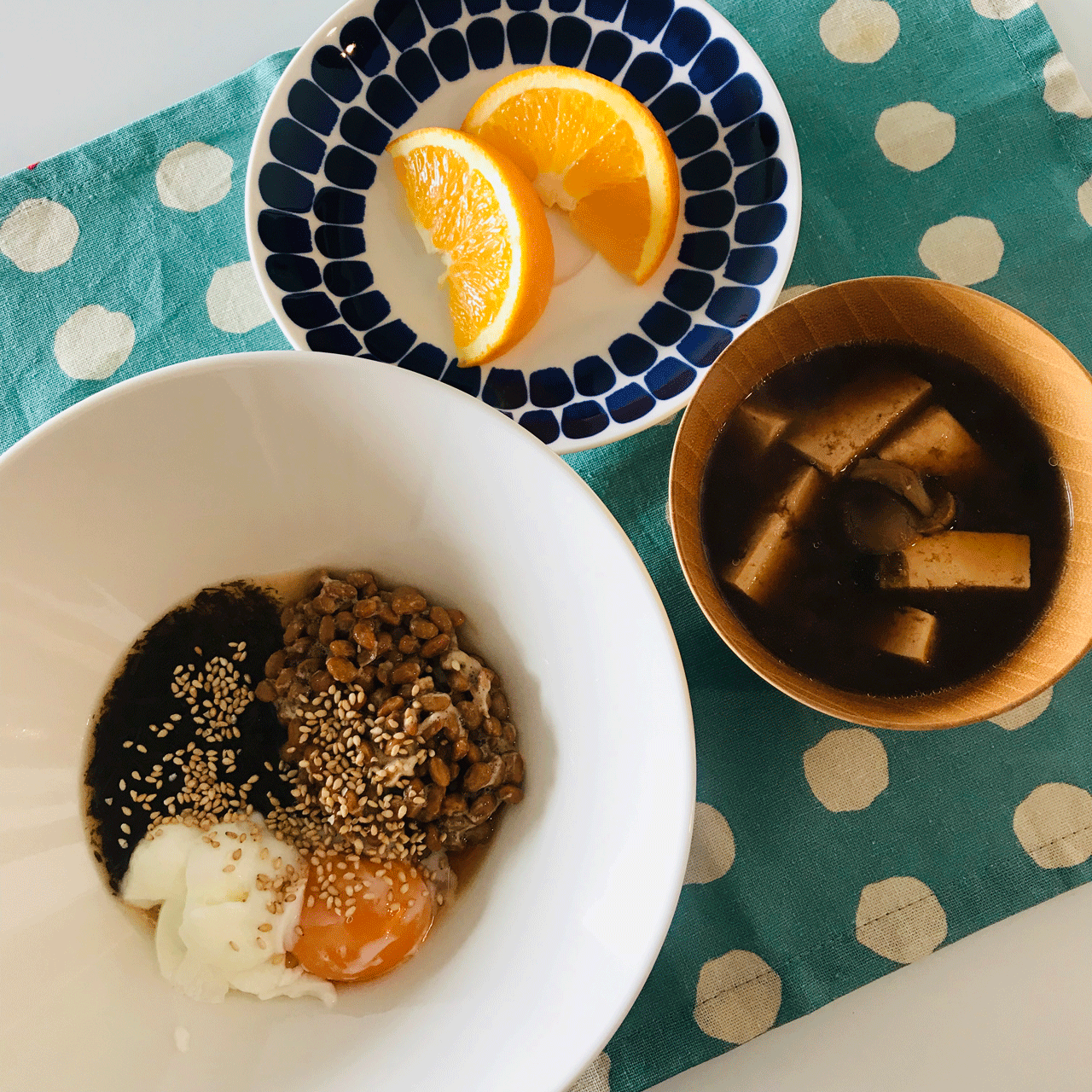 ・アカモク、温泉卵、納豆ゴマ乗せ