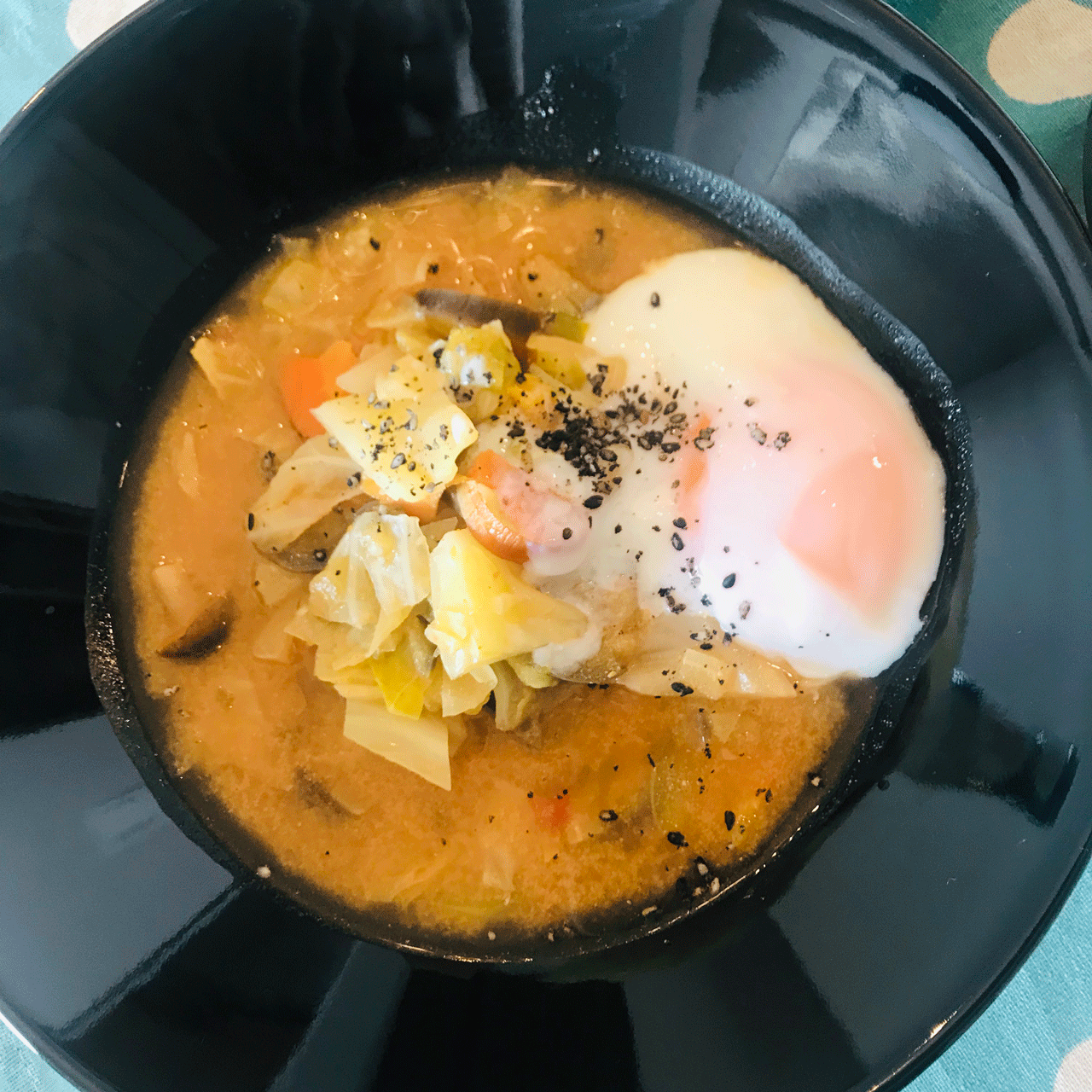 カレー鍋の残りで作るカレースープ、温玉乗せ(キャベツ、トマト、しめじ、カレースパイス)