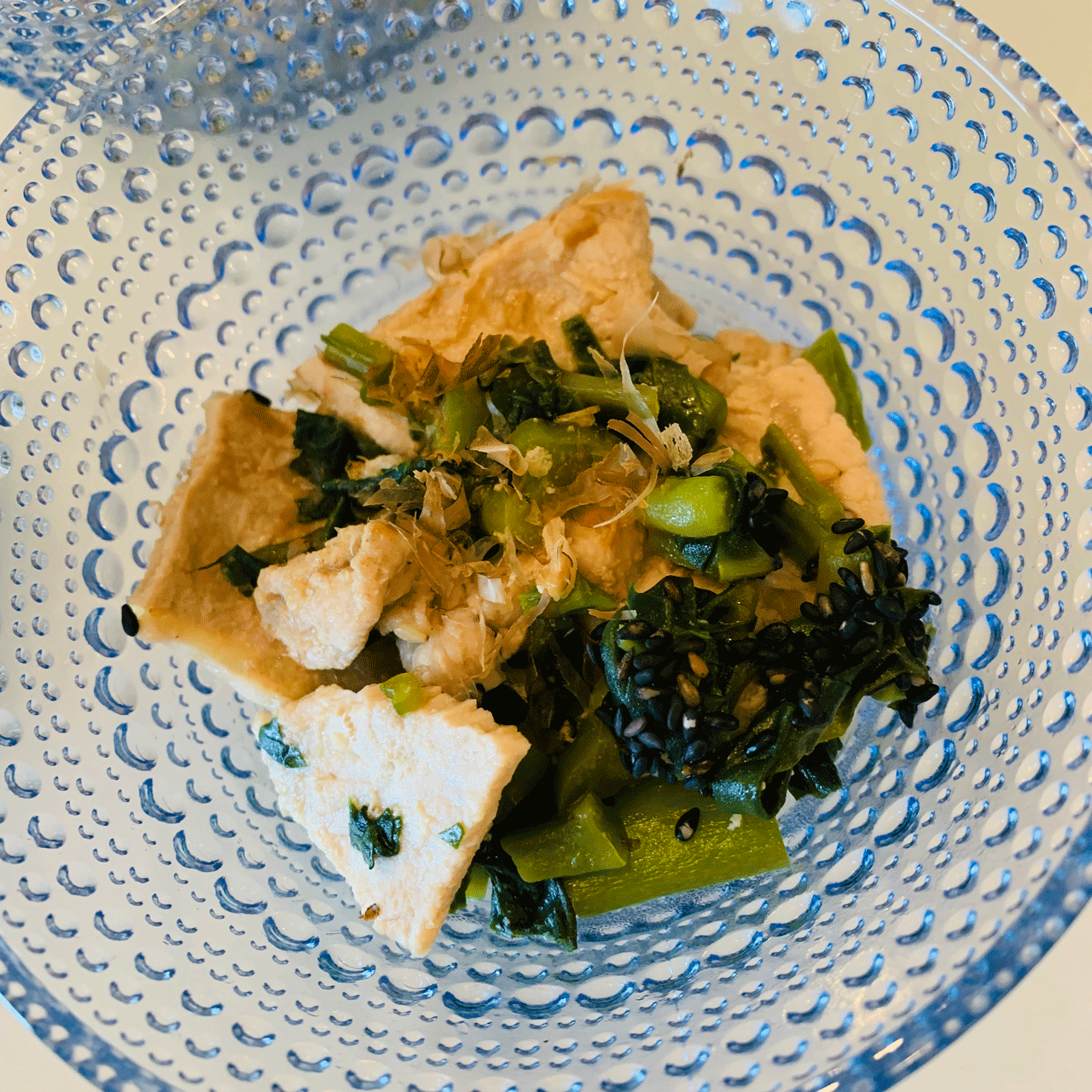 茹でたツルムラサキと炒めた豚肉を合わせて鰹節とゴマかけて完成!