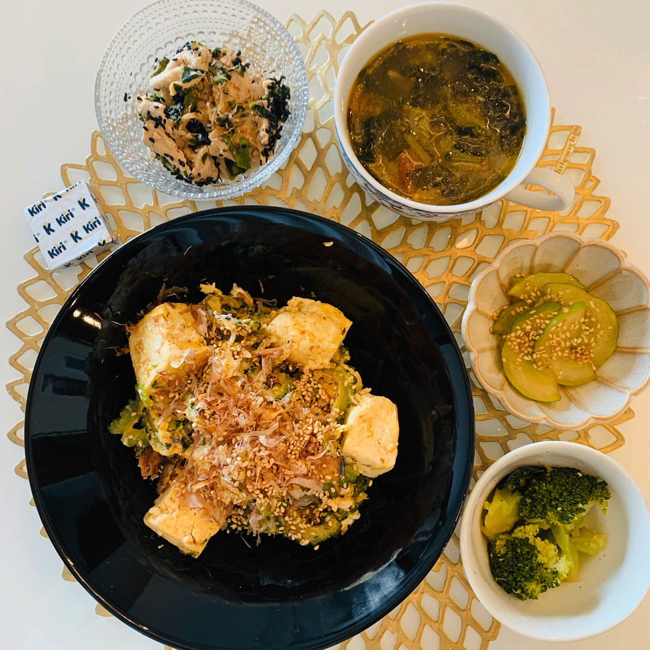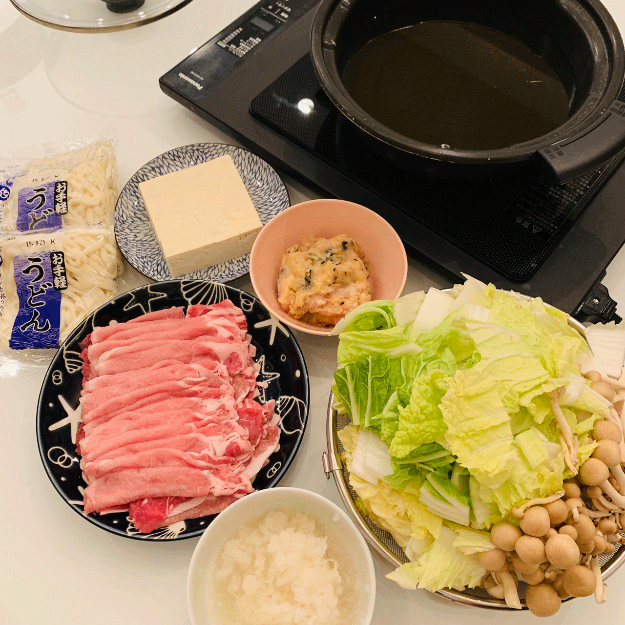 (ゴーヤ、白菜、もやし、しめじ、豚ロース、生おからで作る鶏むねミンチ黒ゴマ団子、豆腐、大根おろし)