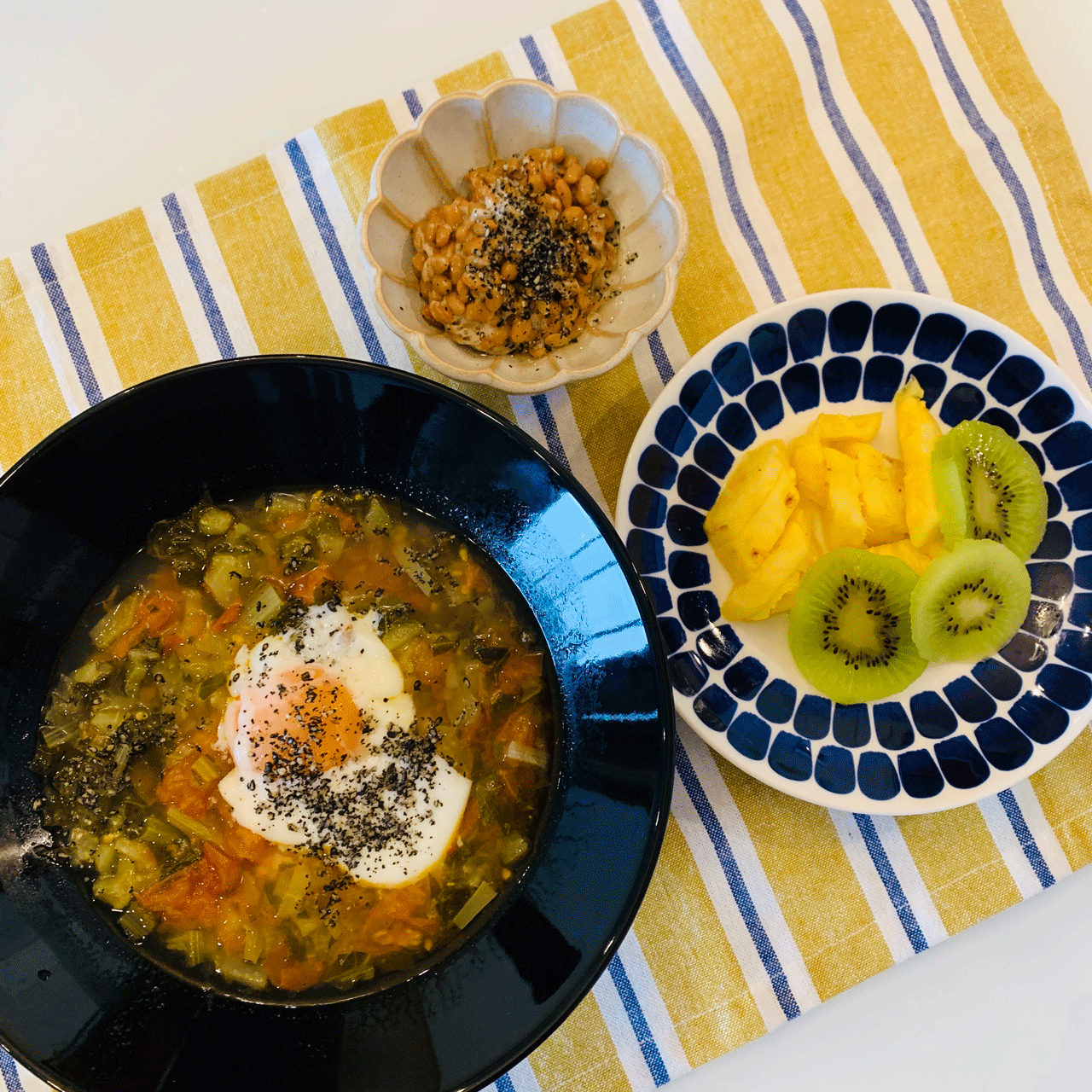 ・小松菜、トマト、オリーブオイル、もやしの中華スープ 温玉、黒ゴマ乗せ