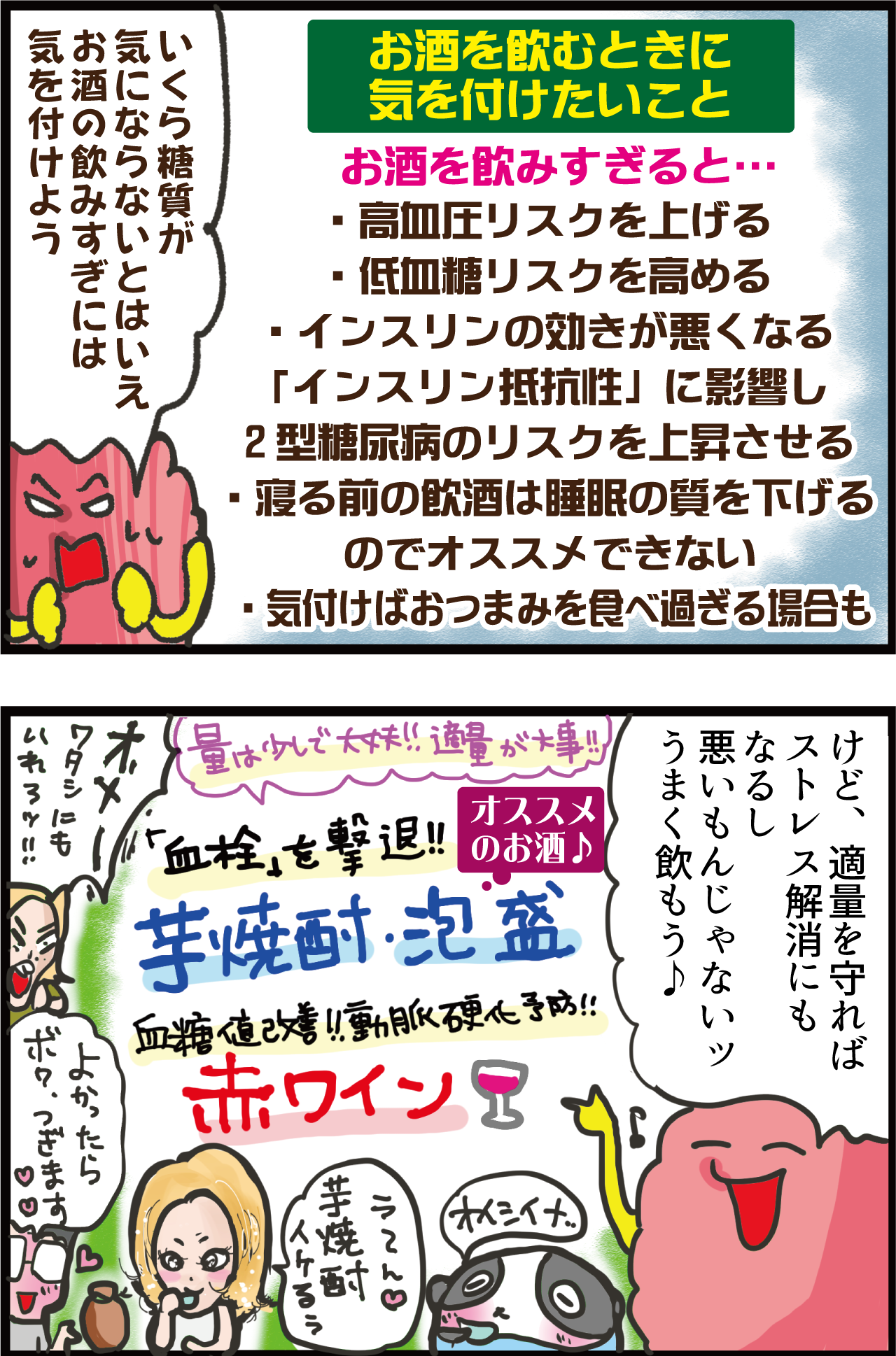 ただ、アルコールの飲みすぎはインスリン抵抗性を引き起こしたり、低血糖や高血圧のリスクをあげてしまうので要注意です。