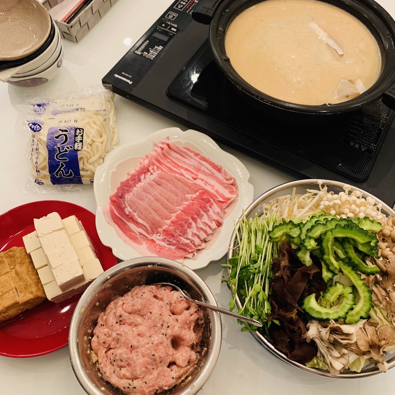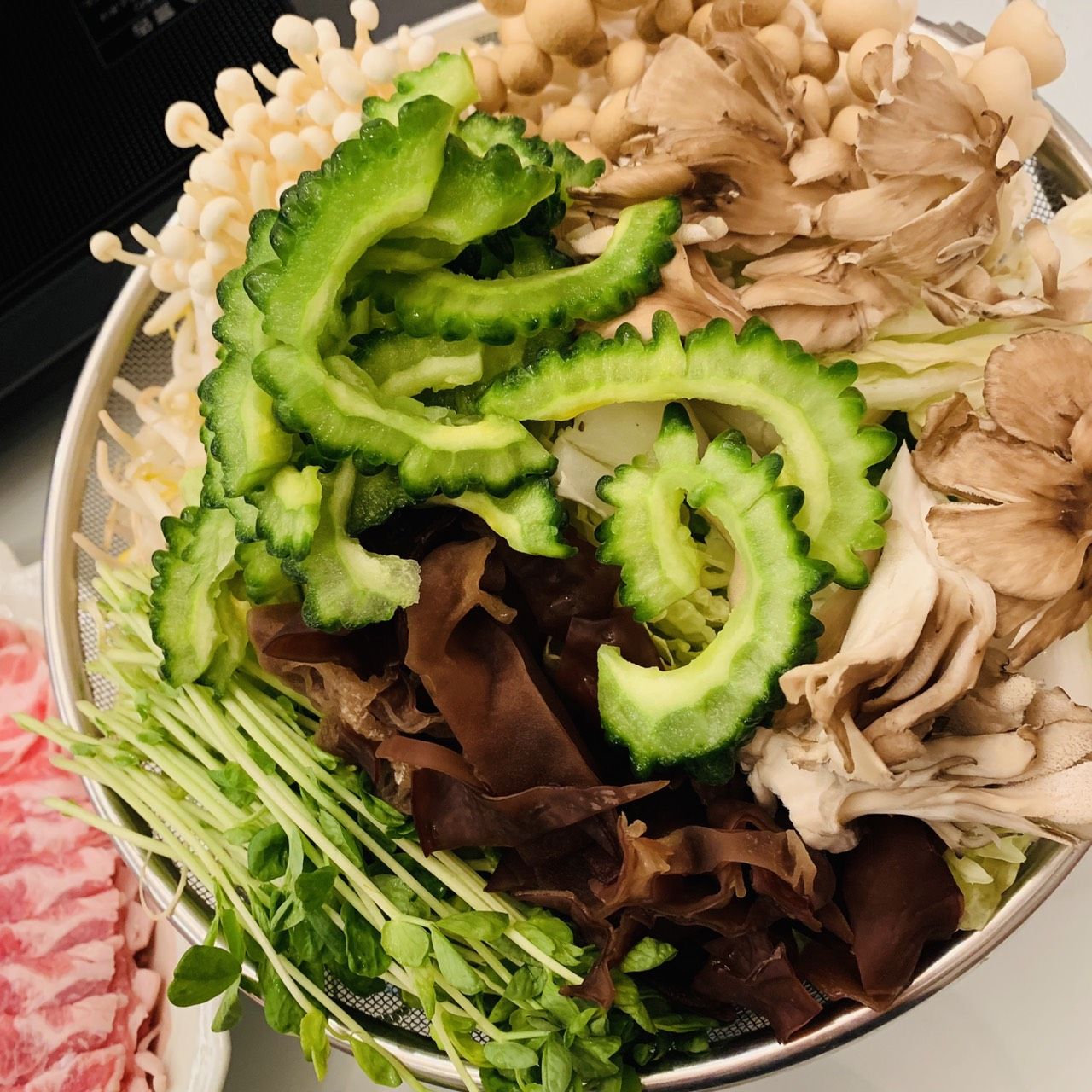 (ゴーヤ、白菜、もやし、えのき、舞茸、豚ロース、生おからで作る鶏むねミンチ黒ゴマ団子、豆腐、厚揚げ、豆苗、キクラゲ)