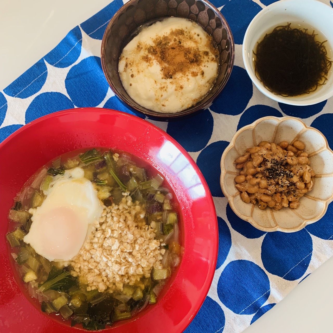 ・中華スープ(もやし、白菜、小松菜、ワカメ、オートミール30グラム、温玉)