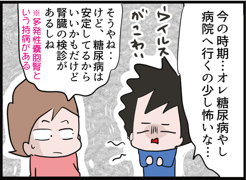 今の時期、糖尿病の定期検診に行くべきか悩んだけど… 前回の定期検診の話今の時期、夫のように糖尿病などの持病がある方や私のような妊婦が病院へ行くのは少し悩むところだと思います。夫も糖尿病の定期検診だけなら無理をせずに飛ばしてもらってもよかったのですが、今回から持病の多発性嚢胞腎の検診と一緒になったので行って ... 2020年03月14日