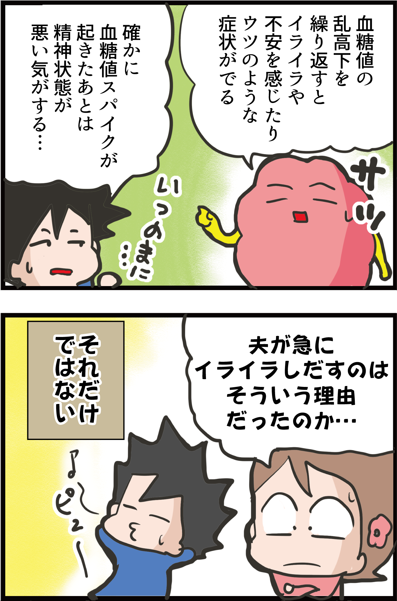 バターたっぷり甘い物とか食べてしまった時に、一時的にハイテンションになるのに、その後イライラしてることがあります。ちょっとの事でキレたり。食べた罪悪感も加わってるとは思いますが。