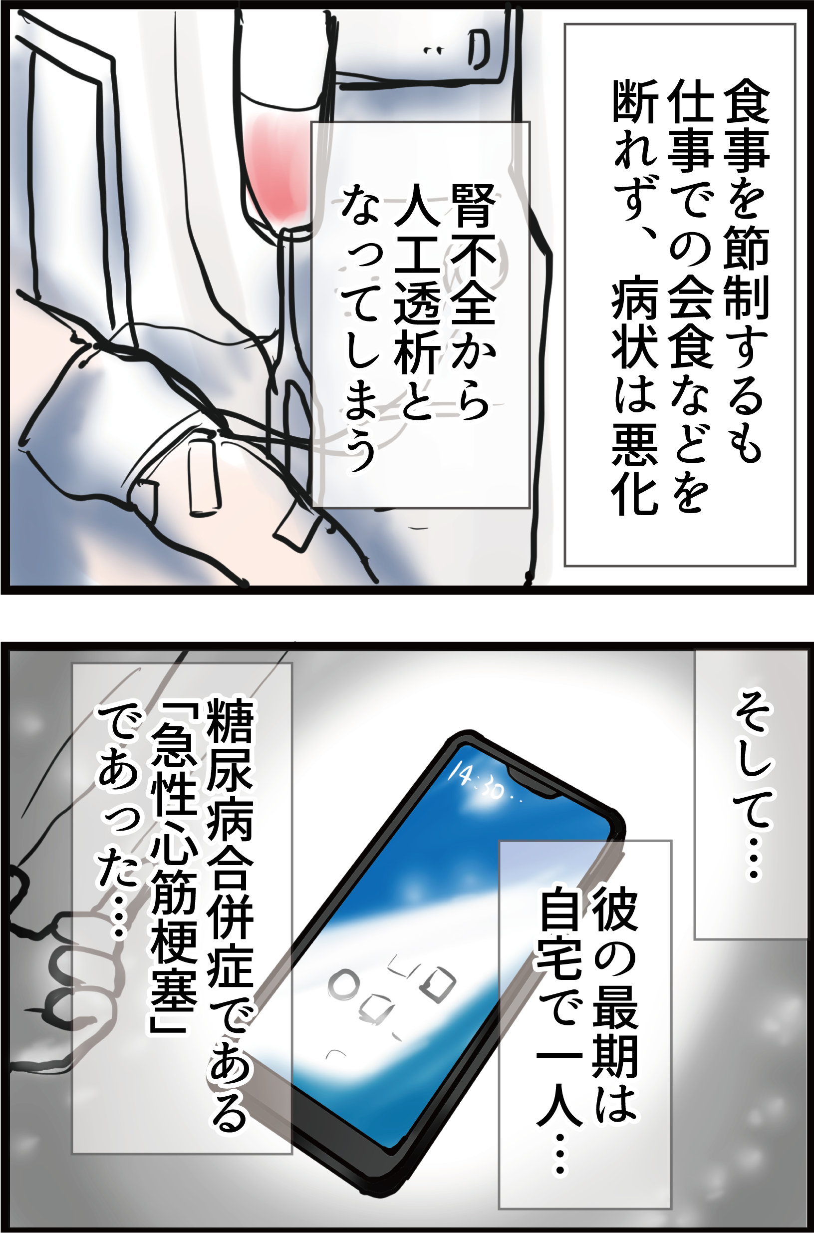 最期は家族の不在中に、人工透析から帰宅した自宅で、一人で携帯電話を片手に息を引き取っていたという話。