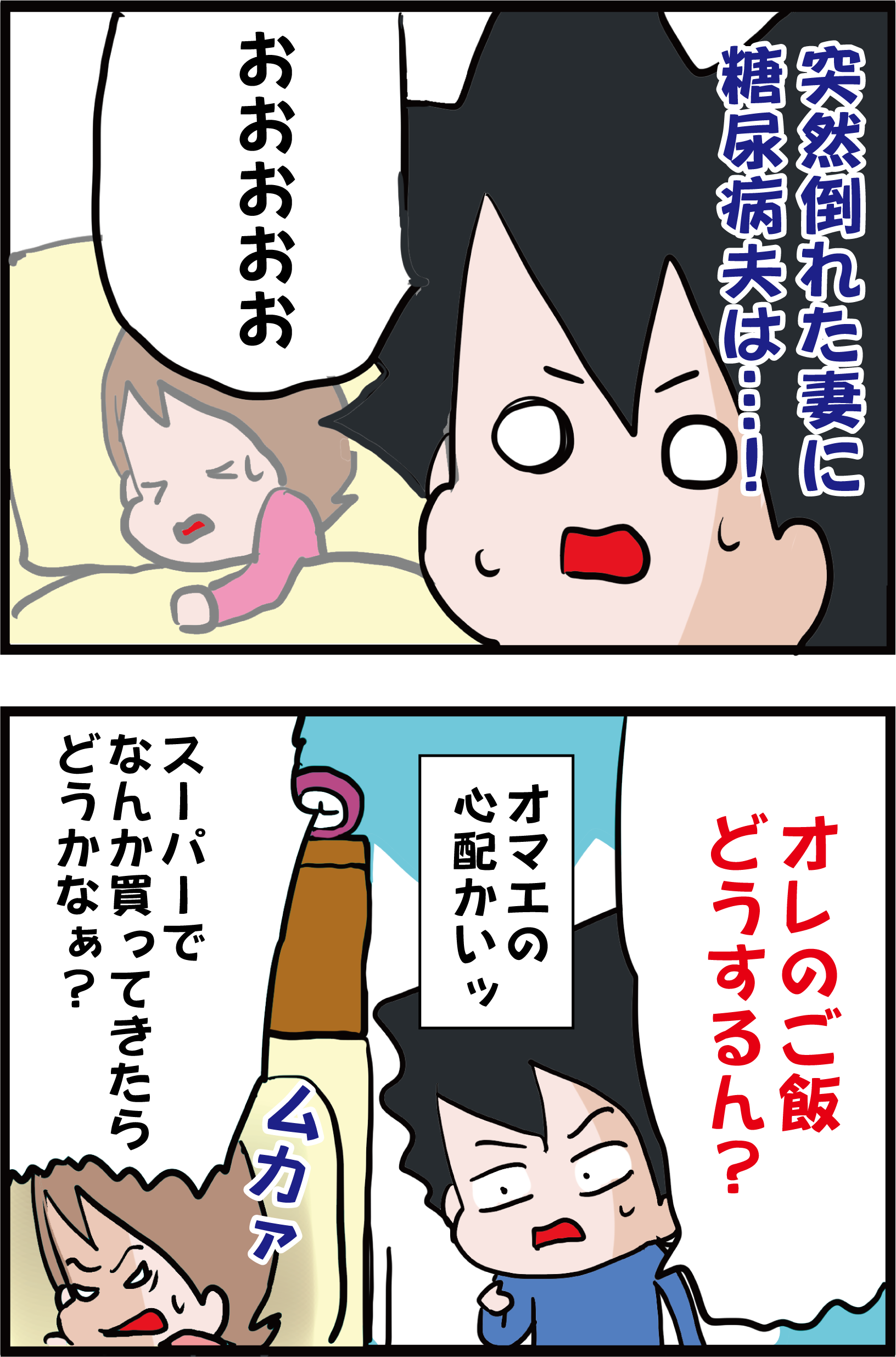 私が寝込んだ時、ウチの夫も相当イライラさせます。メモして行ってもスーパーから電話掛けて来たりして、そのくせ揚げ物を買って来たり全て惣菜で済ませたり(体調悪いのに)。普通の物が食べたくなりますよね。いつになったらちゃんと出来るのやら…