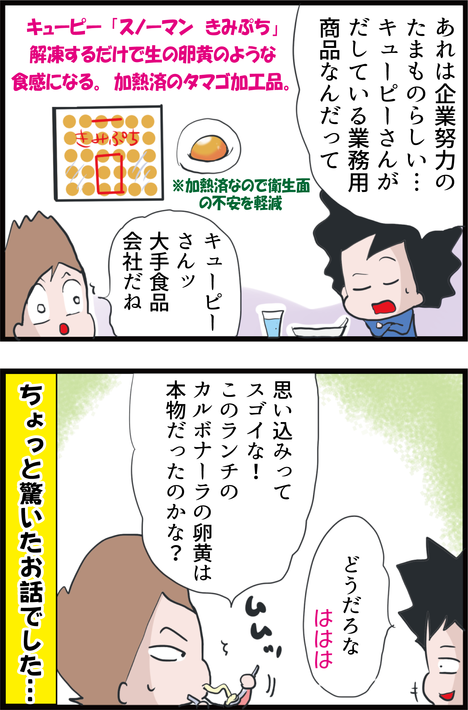 でも、びっくりですよね。考えてみれば、生の卵黄を使える訳ないのに、てっきり卵黄だと思ってしまうキューピーさんスゴイ!