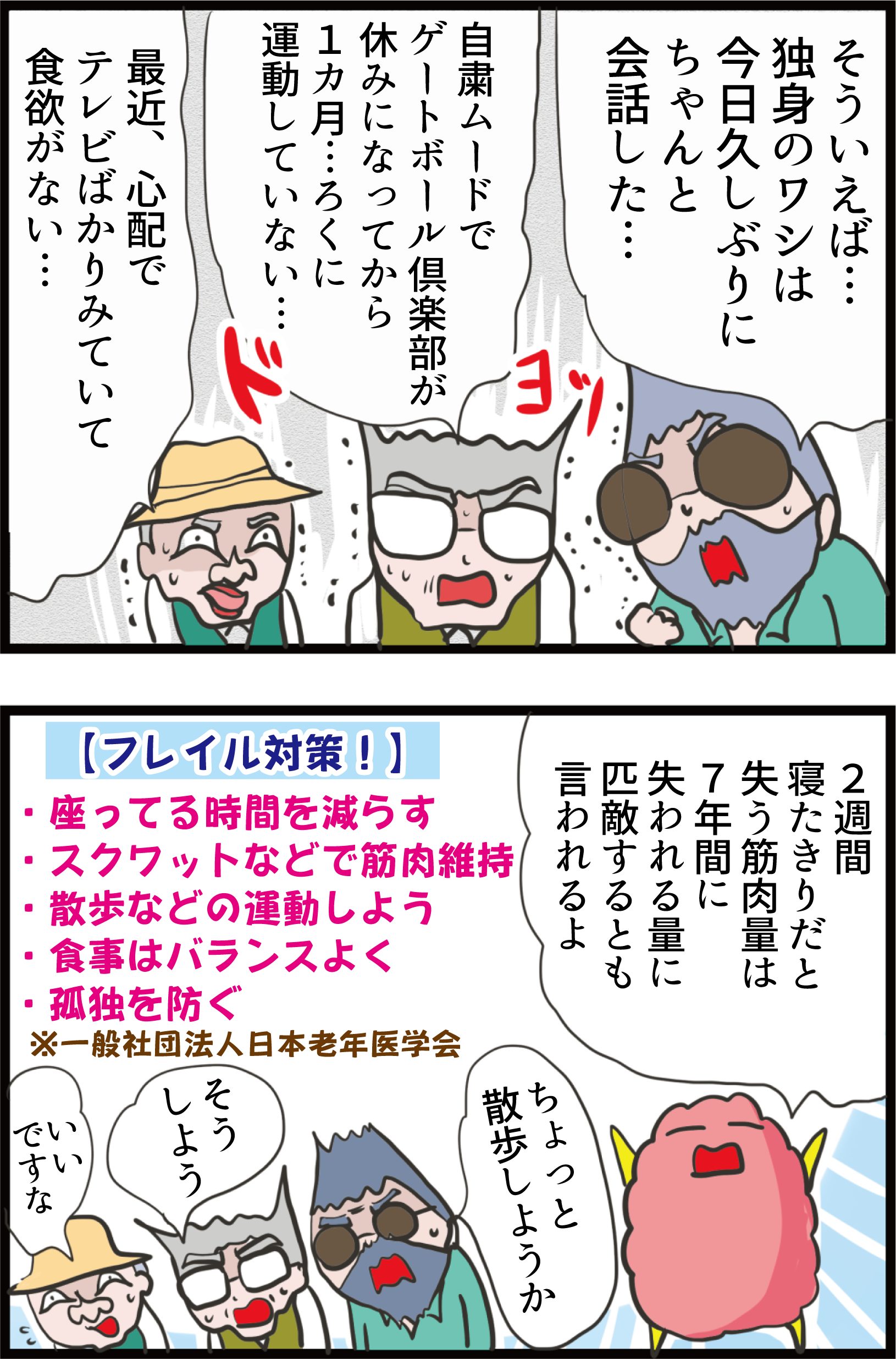 できるだけ、散歩程度の運動をしたり、柔軟体操をしたり、電話などでなるべく人と会話するようにしたり、今こそきっちり食事を摂ったり、できるだけ対策してくださいねー!