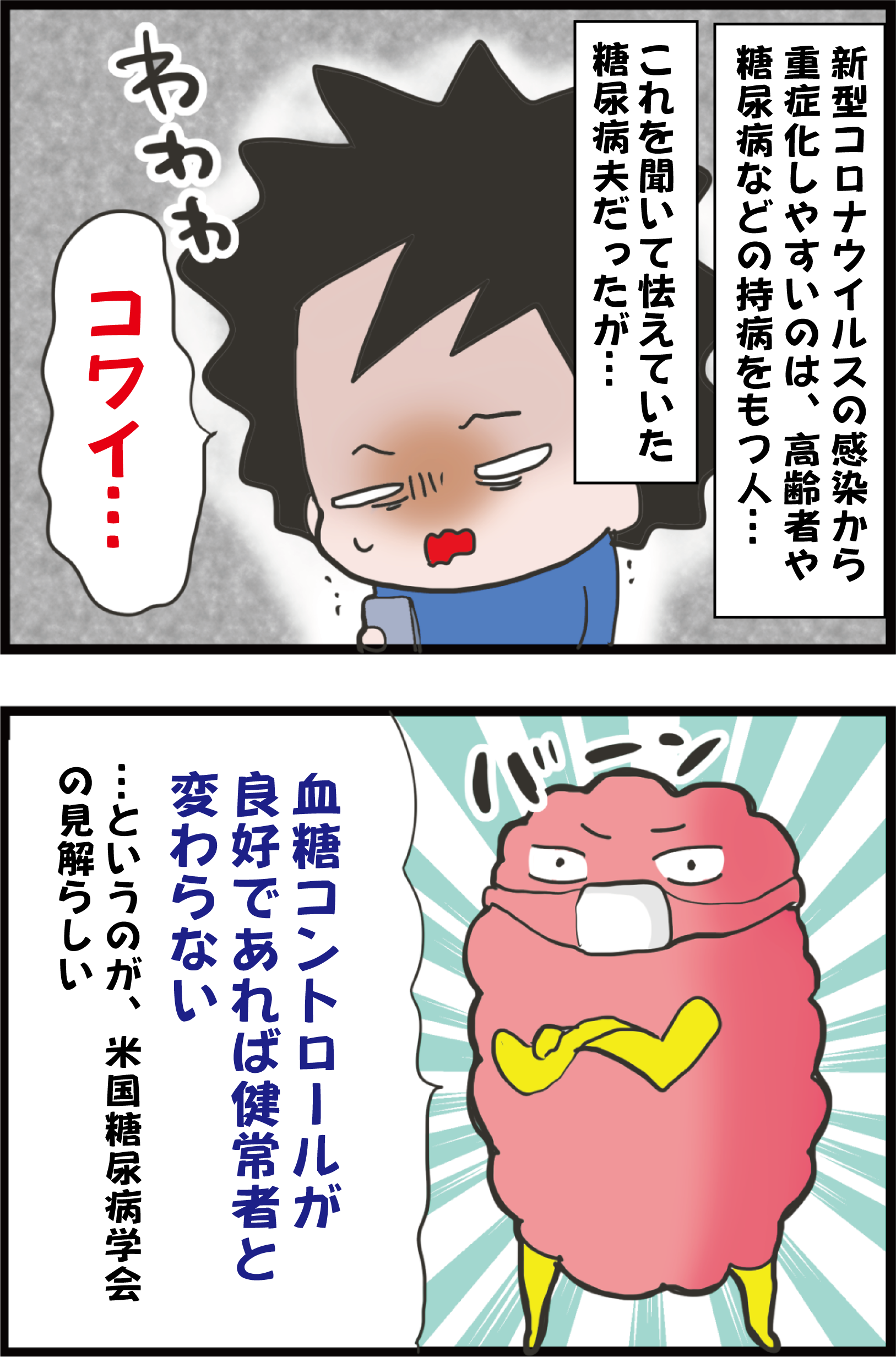 新型コロナウイルスに感染すると、糖尿病などの持病を持つ人は悪化しやすいと聞いて、漠然と恐れていた夫ですが、アメリカ糖尿病学会の見解は血糖コントロールが良好であれば糖尿病でない人と変わらない。