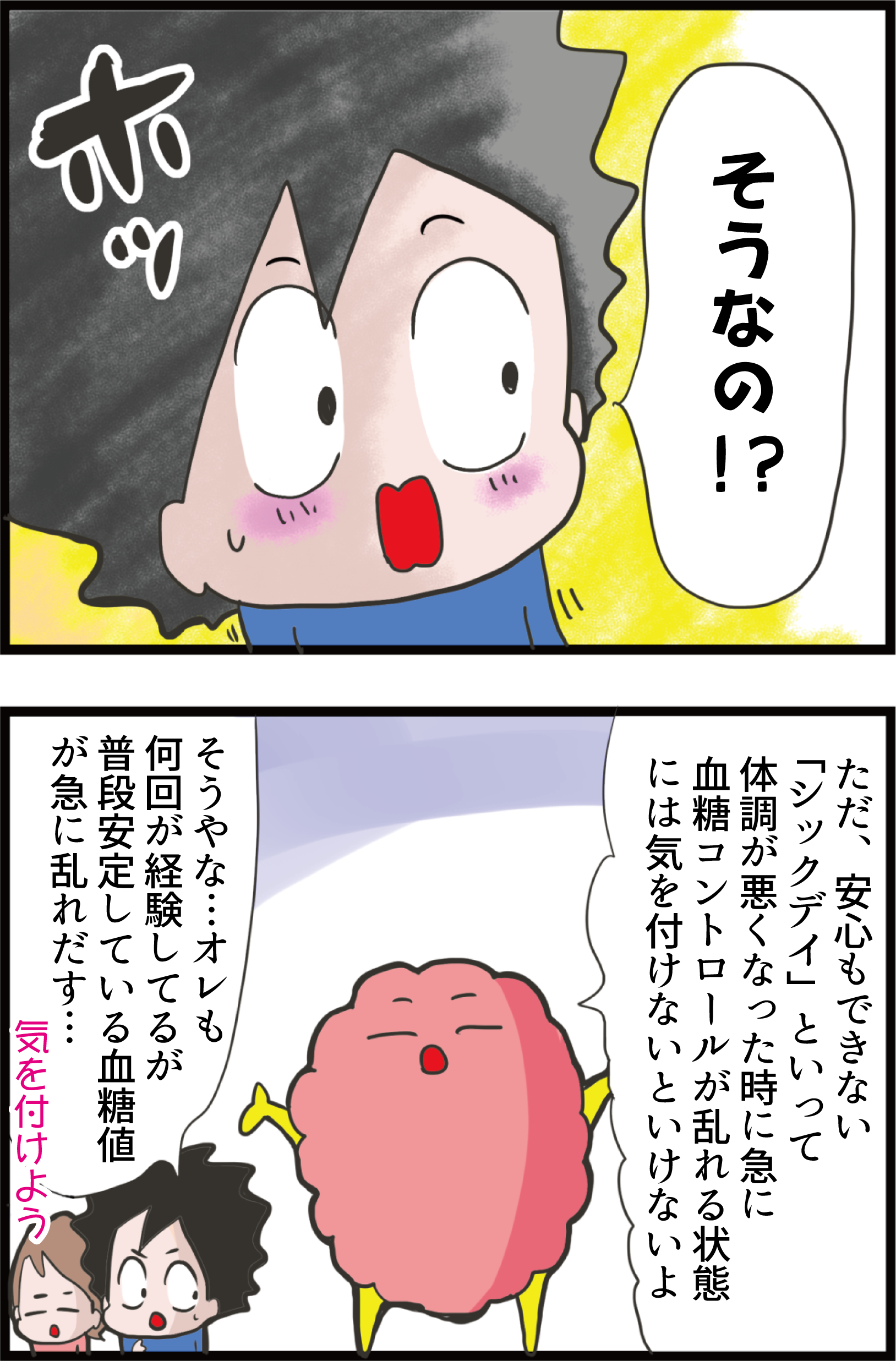 この話は今は血糖値が安定している夫にとって安心できる話でしたが、怖いのはシックデイといって、体調が悪くなると血糖コントロールが乱れる状態。