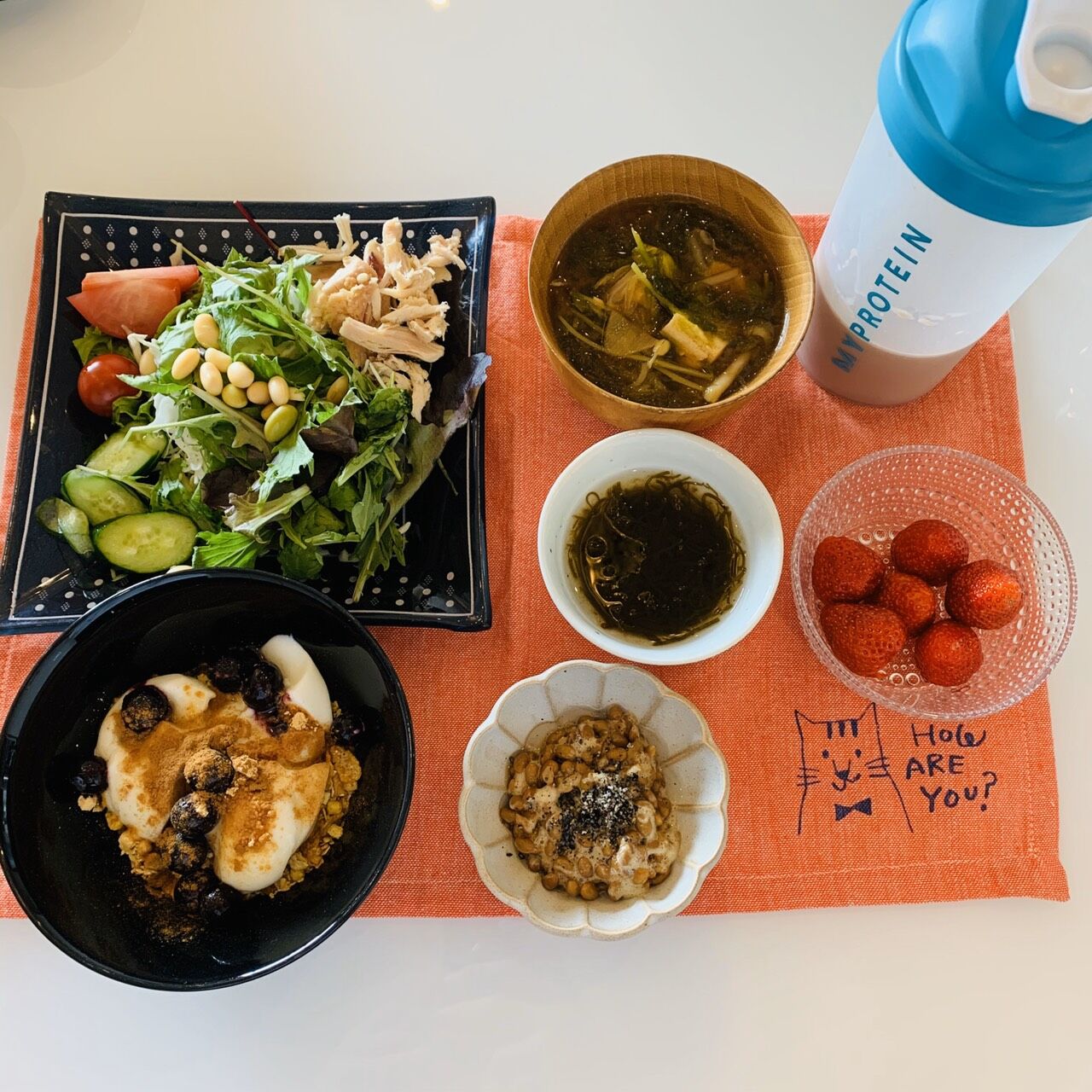 ・サラダ(ベビーリーフ、キャベツ、トマト、サラダチキン、大豆、キュウリ、ナッツ後がけ)