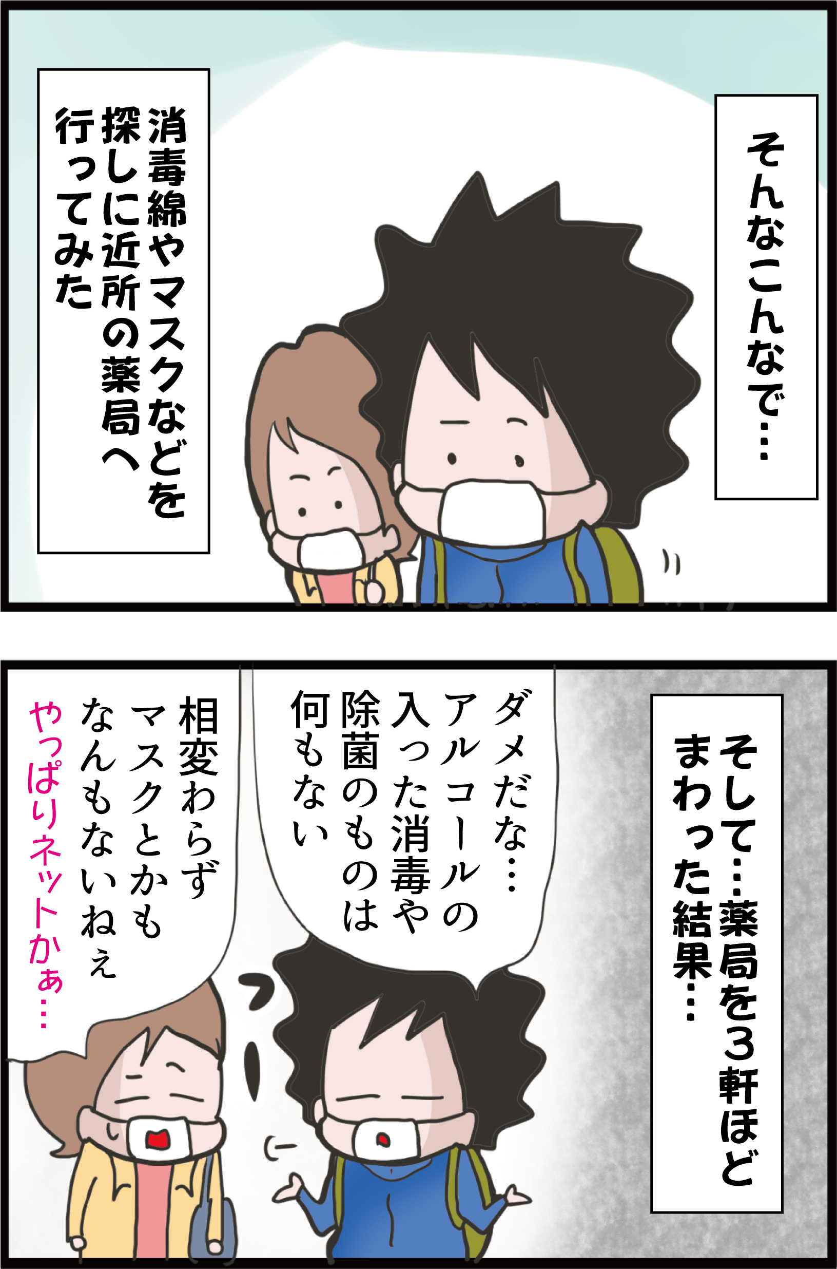 前に余分にもらっていたものがあったので大丈夫なのですが、ドラッグストアでも消毒液は売ってないので困りますね。