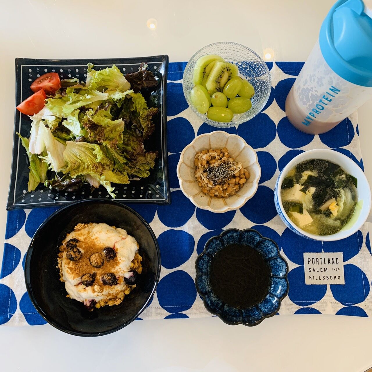 ・オートミール 30g(ヨーグルト、ブルーベリー、きな粉、シナモン、右上のプロテインかけて)