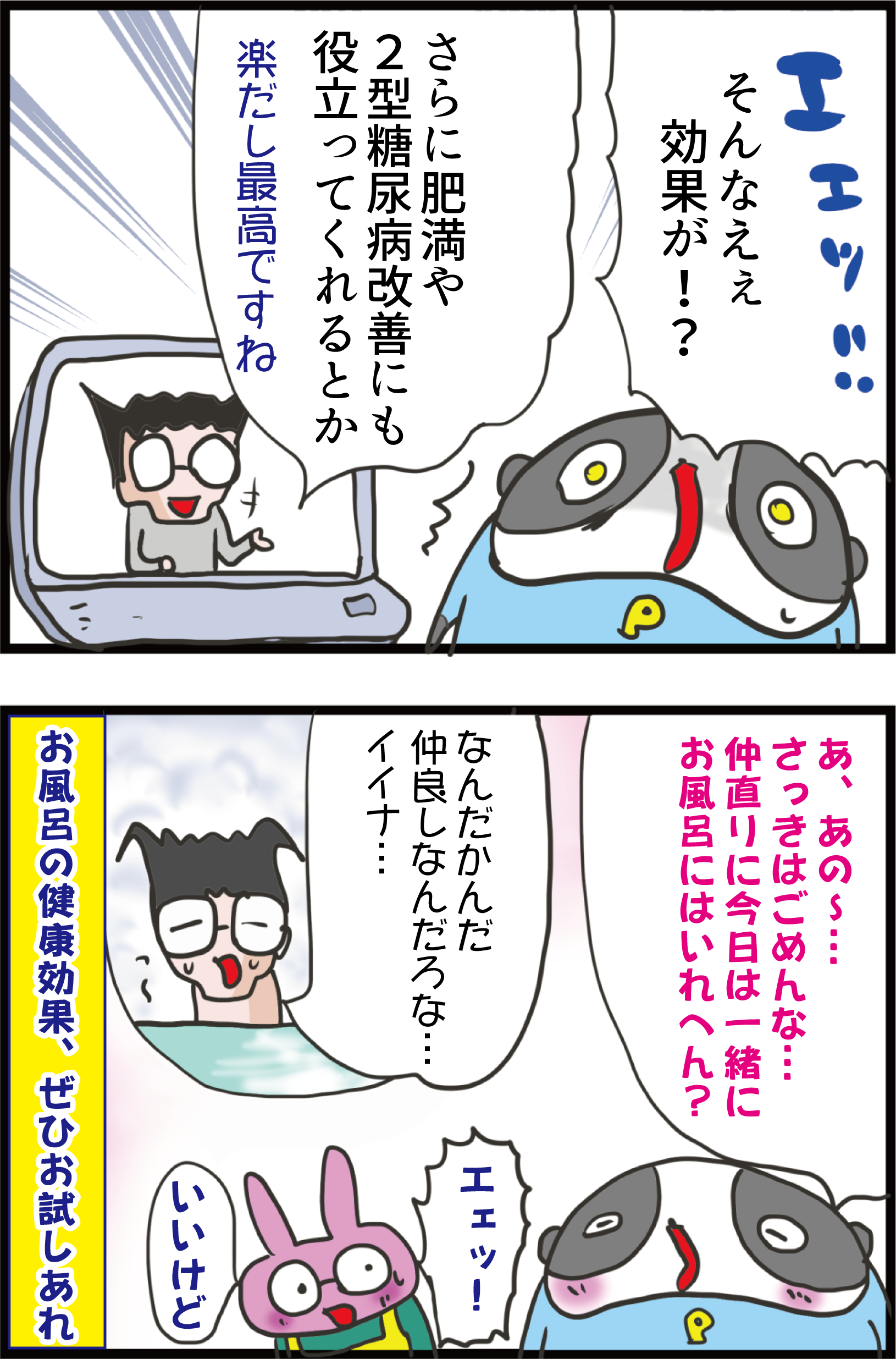 2型糖尿病や肥満を改善するという情報もあるのでぜひ、入浴の時はぜひお風呂につかってリラックスしてください(^○^)