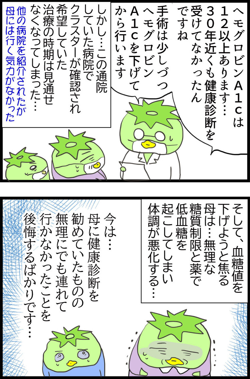 母のお話の続きはお休みして、1年に1度健康診断にぜひ行って欲しいというお話を描きました。