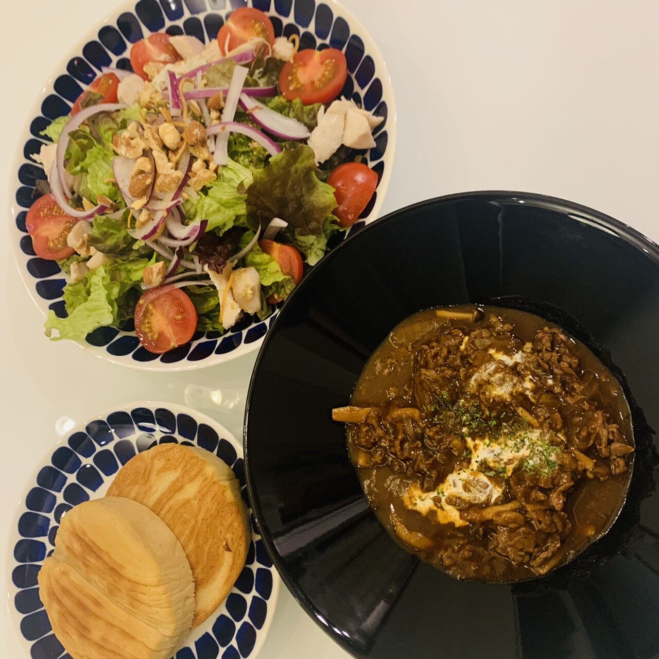 ビーフシチュー、パン、サラダ全部で糖質30~40g程度です。