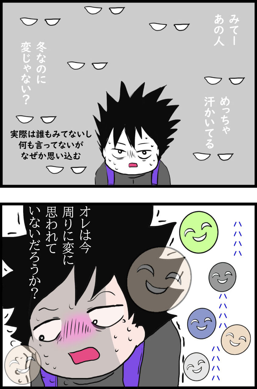 私もマルコさんの旦那さんと同じくHSPの特徴があります。以前は、周りにどのように思われているのか、4〜5コマ目のような不安感がありました。ただ、今は、人は自身のこと以外にほとんど興味がないことが多いと理解したので、私自身が人の目を気にしないようにすることで、不安感はほぼ抱かなくなりました。また、もしも気になったことがあったらその都度相手に「嫌な思いをさせてしまっていないか」等を尋ねることで、ストレスを少なく、人と良好な関係を築けるようになってきたと思います。