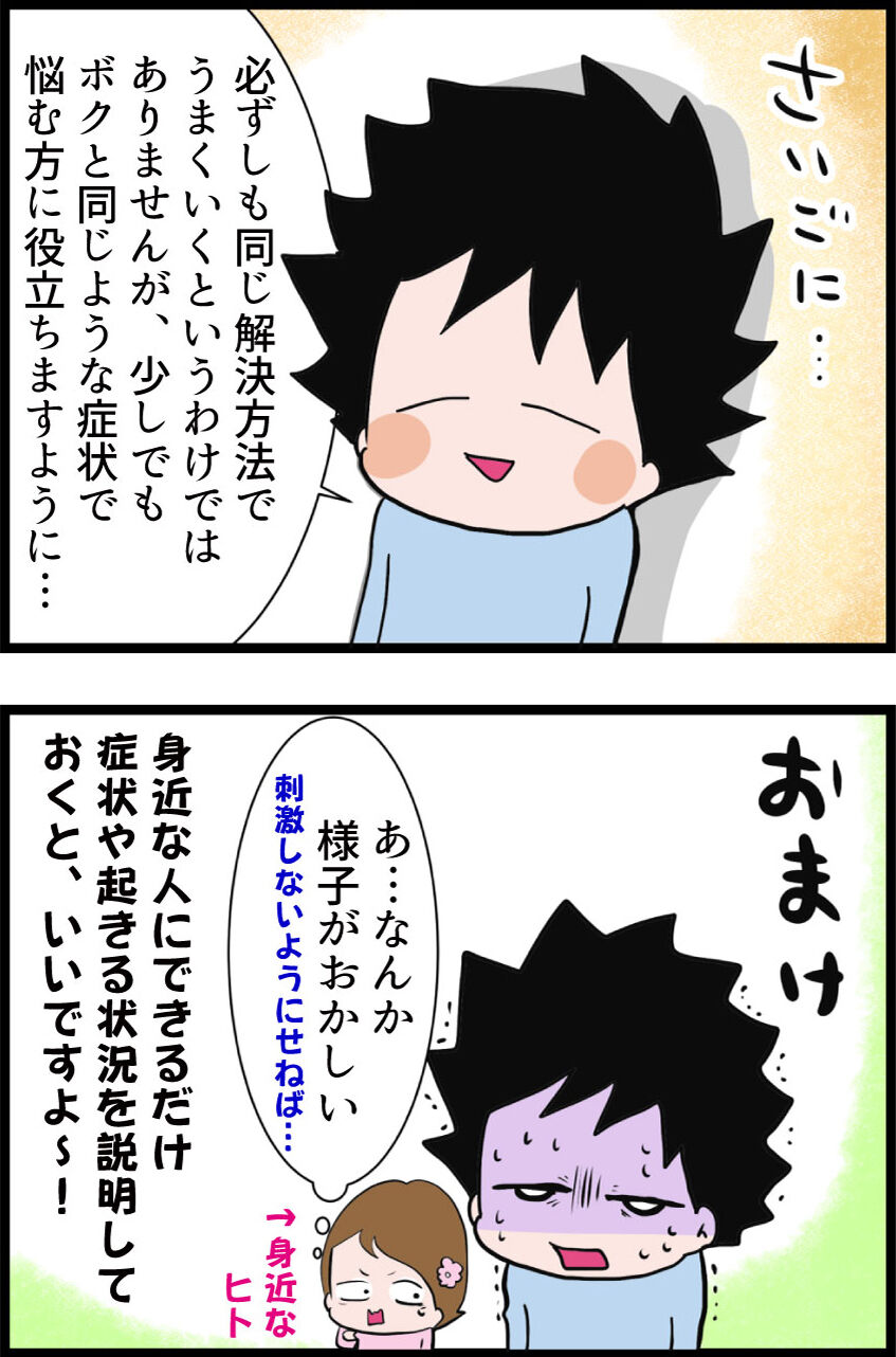 この症状が恐らく完治する事はないと思ってますが、夫の性格の一部と思い、今後も前向きにうまく付き合っていけたらと思っております。