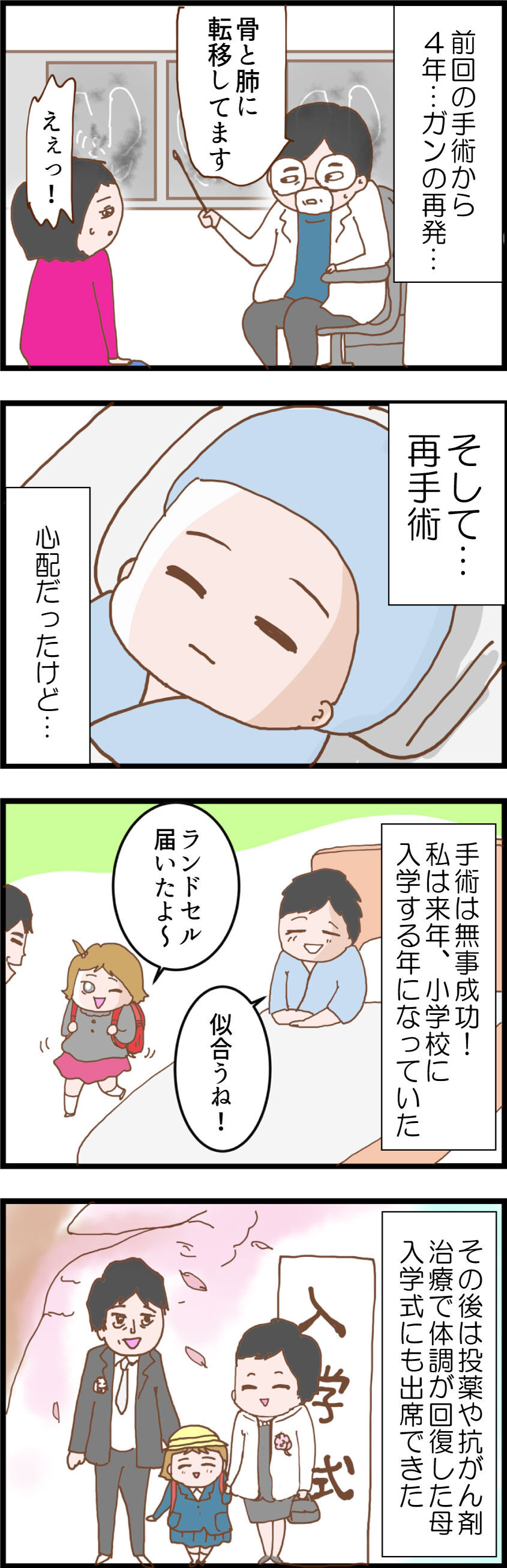神様がくれたママと私の9年間【9】~ガンの再発、再手術…!~ 2021年12月27日 ※読者様から頂いたお話にフィクションを混ぜて描いております。前回のお話 続きを読む ↓最初から読む\\ 今日もご訪問ありがとうございます。/↓ポチっと応援クリックもらえますと、とっても嬉しいです(#^.^#)にほんブログ村お願いします~!↓LINEで毎朝7時に更新通知が受け取れます!現在9810人の方に読者登録していただいてます♡↓連載中!「マッチングアプリで出会った男性が色々ヤバすぎた話」↓連載中「サプリメント中毒中学生」 <おいしく血糖値を上げない♡低糖質レシピ>↓材料3つでできる!低糖質なコーヒーゼリー! ↓野菜が美味しいオイシックスは我が家も定期便で頼んでます! 宅配食材「ミールキット」は時短できて本当に便利♪(おすすめ連載シリーズ!)拒食・過食で餓死寸前となった友人の話↓コロナ渦で糖尿病夫の咳が大変なことに… ↓産後、背中のイボを取りに行った話↓夫のパニック障害の話 ↓壮絶!孤独死寸前だった父が死ぬまでの45日間↓コロナワクチン接種体験談 ~書籍販売しています♪~▽重版決定▽4刷いきました(#^.^#)アマゾン、楽天で販売中! 「神様がくれたママと私の9年間」カテゴリの最新記事 タグ :#コミックエッセイ#体験談#結婚#親子#子育て#母の死#乳がん#ガンの転移 < 前の記事次の記事 > コメント コメントフォーム 名前 コメント 記事の評価 リセット リセット 顔 星 情報を記憶 コメントを投稿する