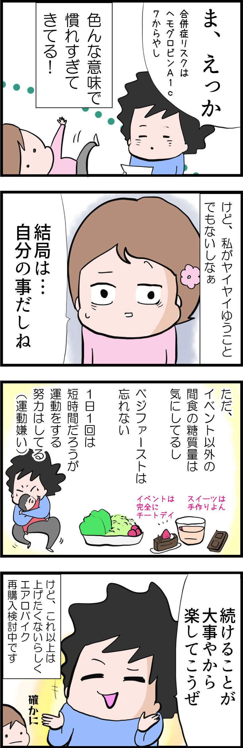 Kタローさんもあがっても許容範囲のヘモグロビンA1cで頑張れてると思います。キュウキュウとしすぎても続かない!継続は力なり!私もだらだらやけど気を抜かずやりますよ~