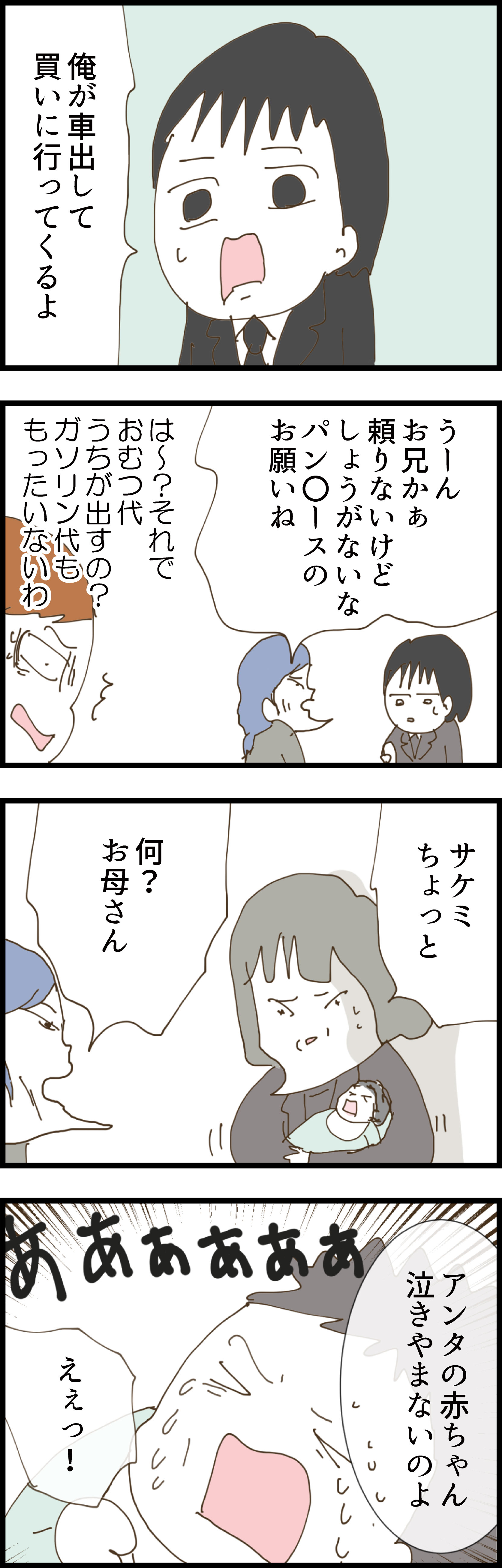 それに葬式でサケミのスエット姿は気にならないのか…産後体型変わったのかもしれないけど、黒のワンピースくらい用意してあげて…