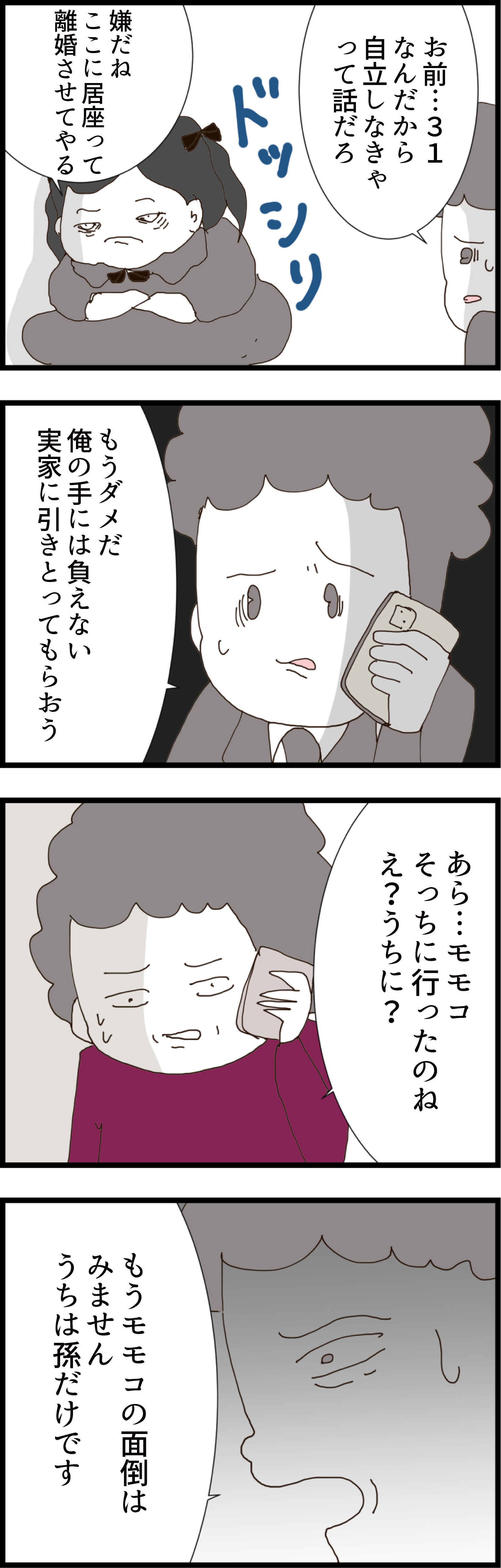 義妹は推し活シングルマザー【55】 2023年07月30日 ↓最初から読む ↓前回のお話 続き この話の一覧はこちら↓続きを読む方はLINEの更新通知がおすすめ! ↓kindle・楽天Kobo・ピッコマ・コミックシーモア・LINEマンガ などなどで配信中!描きおろしも入ってます♪ 【こちら↓も現在連載中です!】 ~書籍販売しています♪~ ▽重版決定▽5刷いきました(#^.^#) アマゾン、楽天で販売中! 「義妹は推し活シングルマザー」カテゴリの最新記事 「読者様体験談」カテゴリの最新記事 タグ :#漫画#コミックエッセイ#義妹#推し < 前の記事次の記事 > コメント コメント一覧 (9) 1. かなし 2023年07月30日 08:24 こんな化け物義妹がいるんだったら、とっとと離婚するのが正解なんだけど… コイツの思い通りになるのも、癪に障るなぁ。 兄貴、ここが正念場… 0 danna-tonyo がしました 2. ほんに 2023年07月30日 09:37 >>1 化け物だよな❗ ドッシリ座った義芋の表情よ笑 作者さん上手いなぁ~笑前回のサケミも酷い顔だったし。 しかし31歳なって子供も居るのにクズだね。 0 danna-tonyo がしました 3. かかし 2023年07月30日 09:39 こういう場合、家族間の問題だから警察は動いてくれないのだろうか? 傷害事件になったりしないと無理なのかな? というか、この兄が甘々すぎるんだよね ナメられてるから居座られてるわけでしょ? 引きずってでも家の外に追い出せばよくない? 0 danna-tonyo がしました 4. 同じく 2023年07月30日 09:57 >>3 警察…、と思ってしまったが無理なのかな。 こんなに酷いと精神病院に引き取ってもらえたりしそうですけど(ひと昔前なら?)。 迷惑すぎるやろ。 自分勝手すぎる。 0 danna-tonyo がしました 5. かかし 2023年07月30日 10:32 >>4 この作者さんのお話には警察弁護士は登場しませんが、実際問題こういう時ってどうするのが正解なんだろう? 親の育て方って言う人がいるけど必ずしもそうじゃない場合もある。(この話ではモモコの母親兄ともに甘々すぎたけど) 精神病院に入れるにしても費用を負担するのはその家族…? 色々考えてしまいました。 0 danna-tonyo がしました 6. りゅう 2023年07月30日 11:35 この旦那。。。 諦めるのが早すぎる! 実妹なのだから、もっと強気で叱り、説得しろ!!! みわさんも、早く見切りつけてください。。。 0 danna-tonyo がしました 7. あり 2023年07月30日 12:48 義妹にとって幸せ🟰仕事・育児せず、推し活三昧 なんね。 こんな娘に育てた環境もスゴいわ😓 0 danna-tonyo がしました 8. 一読者 2023年07月30日 15:38 ここでクソ旦那がどう対応するかで離婚が婚姻継続か決まるよ!「あんな妹だから仕方ない、嫁に面倒事を受け入れて貰うしか無い」じゃダメなの!頑張れ! しっかし…こういう時って本当にどうすれば良いんだろう?外に引きずり出すにもモモコの体重じゃ実際難しいよね… 0 danna-tonyo がしました 9. かばやき 2023年07月30日 20:10 離婚してクソ妹に一生搾取されるか、兄弟の縁を切る覚悟で追い出すか。 前者を選びそう、、、 0 danna-tonyo がしました コメントフォーム 名前 コメント 記事の評価 リセット リセット 顔 星 情報を記憶 コメントを投稿する