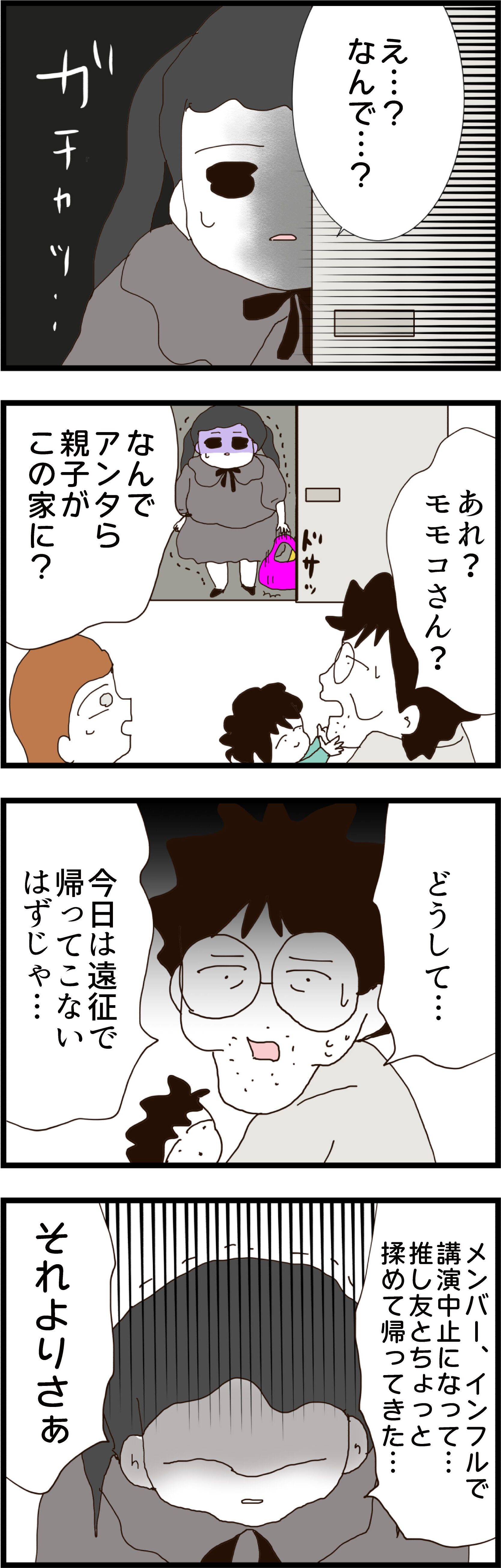 義妹は推し活シングルマザー【171】 2023年11月23日 ↓最初から読む ↓前回のお話 続き この話の一覧はこちら↓続きを読む方はLINEの更新通知がおすすめ! ↓kindle・楽天Kobo・ピッコマ・コミックシーモア・LINEマンガ などなどで配信中!描きおろしも入ってます♪ 【こちら↓も現在連載中です!】 ~書籍販売しています♪~ ▽重版決定▽6刷いきました(#^.^#) アマゾン、楽天で販売中! 「義妹は推し活シングルマザー」カテゴリの最新記事 「読者様体験談」カテゴリの最新記事 タグ :#漫画#コミックエッセイ#義妹#推し < 前の記事次の記事 > コメント コメント一覧 (5) 1. しまじ 2023年11月23日 08:07 ヒゲタは誰にもいい顔して結局だれも幸せにできず、不幸にしていく人だ。正直、ヒゲタターンはもういいよ、、、 0 danna-tonyo がしました 2. これは 2023年11月23日 08:10 ヒゲタが悪い 隠れてコソコソ会わずにモモコに相談すればよかったじゃん モモコは産むだけ、家事育児しない宣言してそのうえ推し活の金もらっててわがまますぎるぞー 0 danna-tonyo がしました 3. あーあー 2023年11月23日 08:53 そりゃーヒゲタが悪いわ💦 0 danna-tonyo がしました 4. 😱💨 2023年11月23日 11:09 モモコがいない間に他の女とその子供を家に連れ込むなんて、そりゃないよ💦 どんな事情があったにしても。 全く何やらかしてくれてるんだよ。 せめてモモコにひと言、言っといてほしかったね。 0 danna-tonyo がしました 5. 「。」改めて(´ω`) 2023年11月23日 13:08 どんな事情があろうと嫁が居ない間に家に勝手に呼ぶのはダメでしょ💦 それにしてもこのマッチングアプリで出会った子連れの女性も何やってるのさ💦 0 danna-tonyo がしました コメントフォーム 名前 コメント 記事の評価 リセット リセット 顔 星 情報を記憶 コメントを投稿する