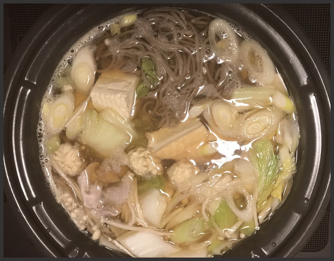 中身(白菜・白ネギ・エノキ・厚揚げ・豆腐・そば・鶏むね肉ミンチ団子・豚肉)