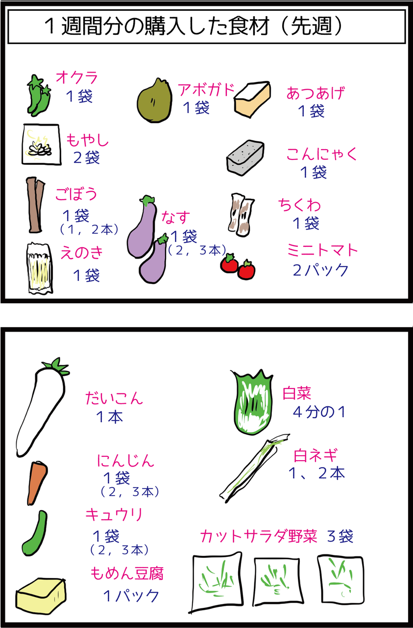 1袋100円くらいで、毎食夫に出して2日くらいもつかな・・