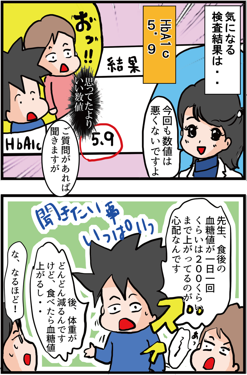 食後血糖値の上がり方は気になりますが、Hba1cは安心できました。
