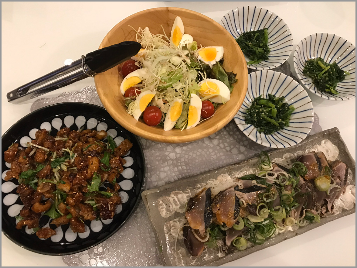 (ほうれん草茹でて、水でさらし、醤油、ゴマ油ふっとく。テーブルで出すときはかつお節をかけて)