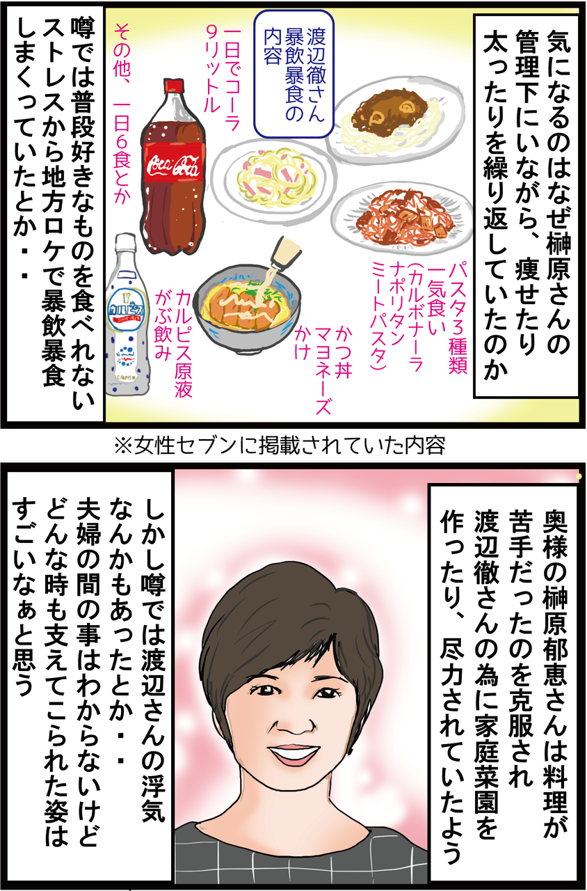 渡辺さんの暴飲暴食時の食事には本当に驚いたけど、多分普段我慢しているから反動であんな食事になってしまったのだろう