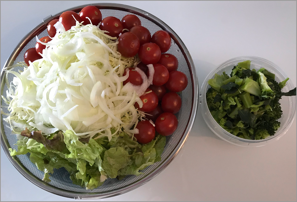 サラダ(レタス、キャベツ、水でさらした玉ねぎ、ミニトマト)とブロッコリー茹でたの
