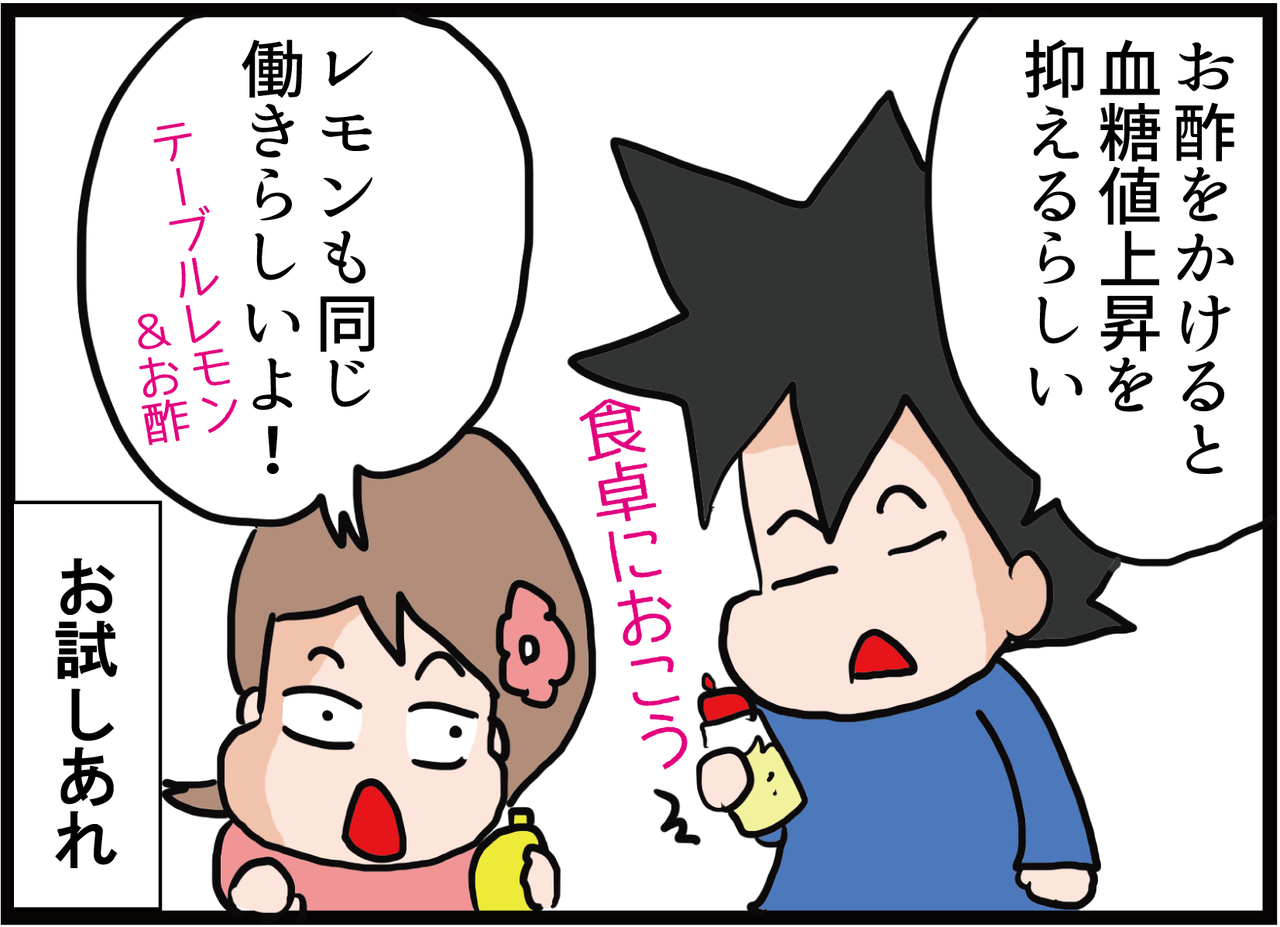 ケンカツ様の【糖尿病対策】食後血糖値を下げる効果がある食べ物は、酢と牛乳、そしてレモンの記事を参考にさせて頂きました